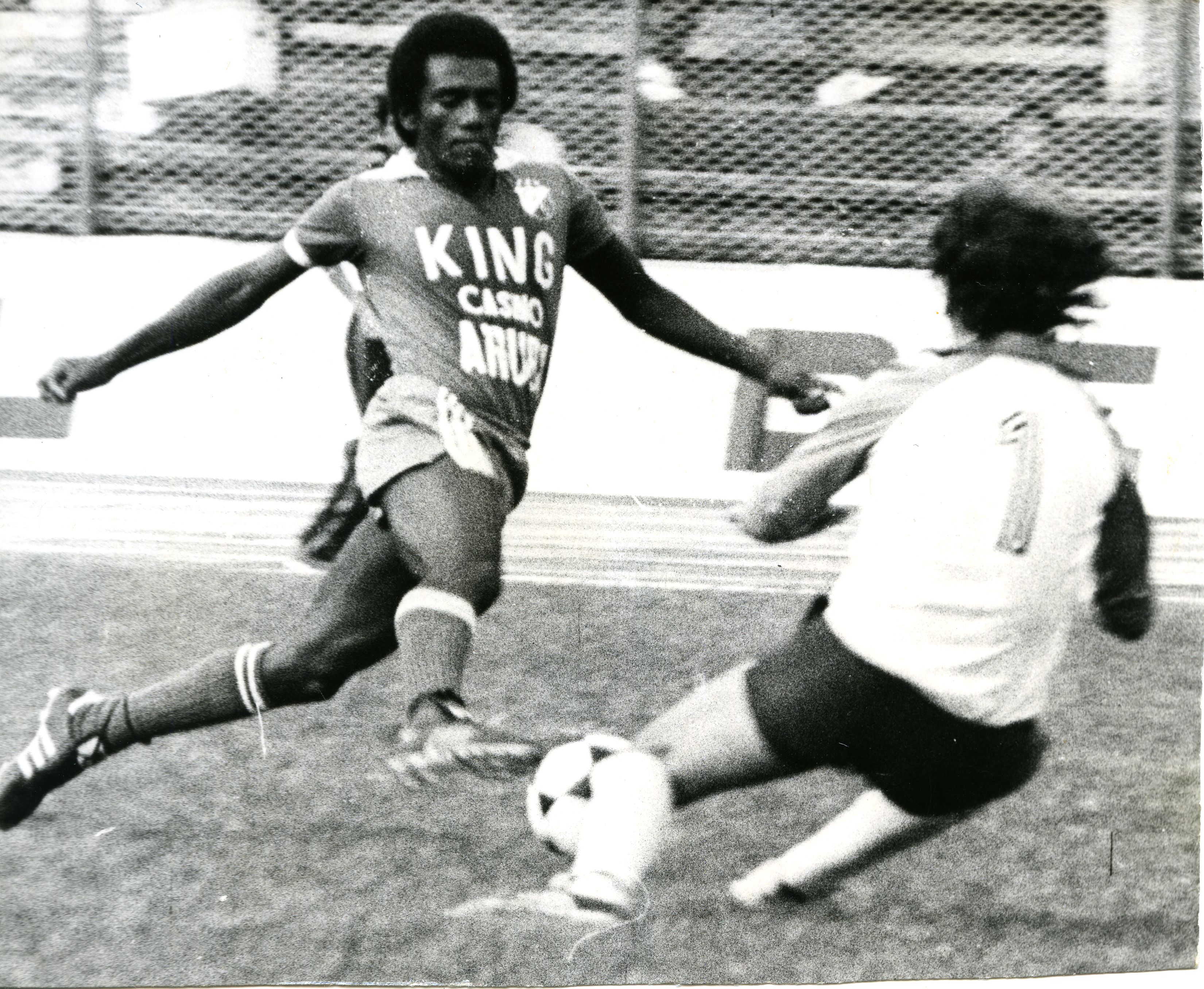 Foto cuerpo completo Gilmar Aponzá jugando con un balón que se encuentra en la esquina inferior izquierda