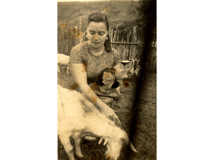 La señorita Blanca Marín Castillo, con su sobrina, alimentando un chivo