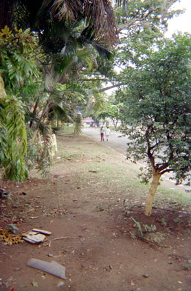 Exterior día. Primer plano de separador vial con vegetación. Mujeres en contraplano en centro de escena. Zona verde actuando como marco natural.