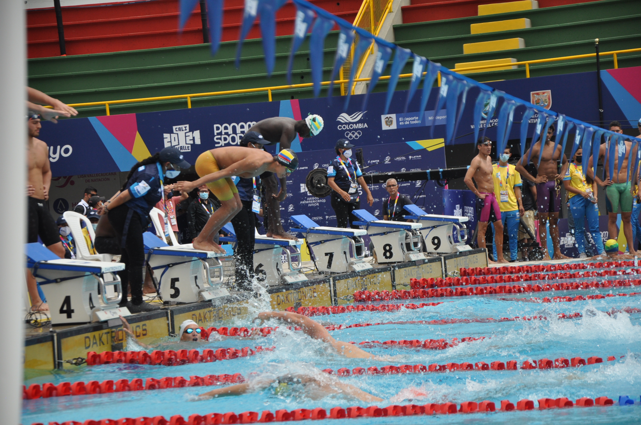 En la fotografía podemos observar a los deportistas participantes en la prueba de natación dando inicio a este reto deportivo en los "I Juegos Panamericanos Junior", llevados a cabo en la ciudad de Cali.