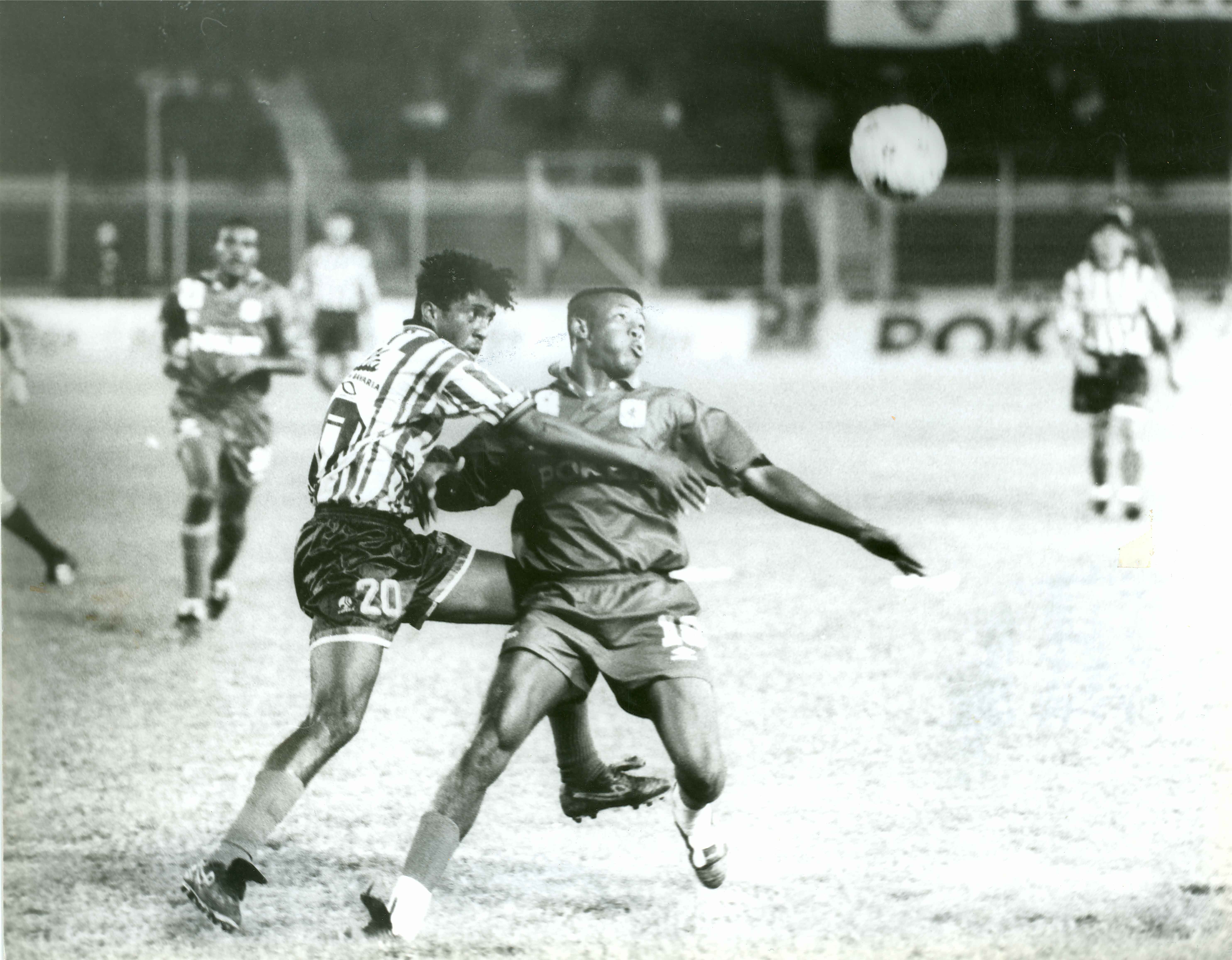 Diario Occidente (1900). Jairo “el Tigre” Castillo, jugador del América de Cali, disputando un balón en el aire. Santiago de Cali: Biblioteca Departamental Jorge Garcés Borrero.