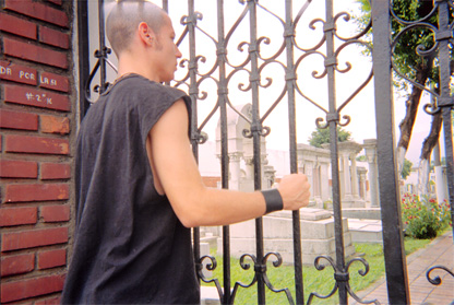 Plano general. Hombre sujetando reja de entrada al cementerio judío. En el plano medio tumbas. Exterior día.