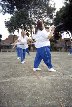 Plano general. Señoras del grupo de la tercera edad realizando ejercicios. Al fondo edificaciones del barrio Las Ceibas. Exterior día.