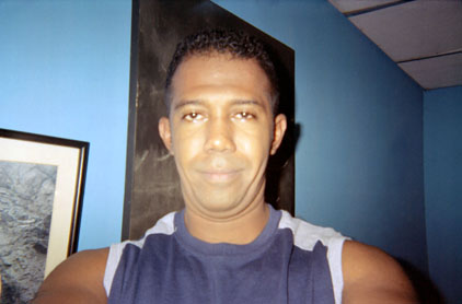 Primer plano. Interior noche. Autorretrato con fondo azul. Sobresalen formas rectangulares de fondo.