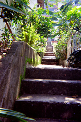 Plano general. Imagen tomada en exterior, donde se aprecia en el centro de la imagen unas escaleras en concreto. A cada lado de ella vegetación abundante.