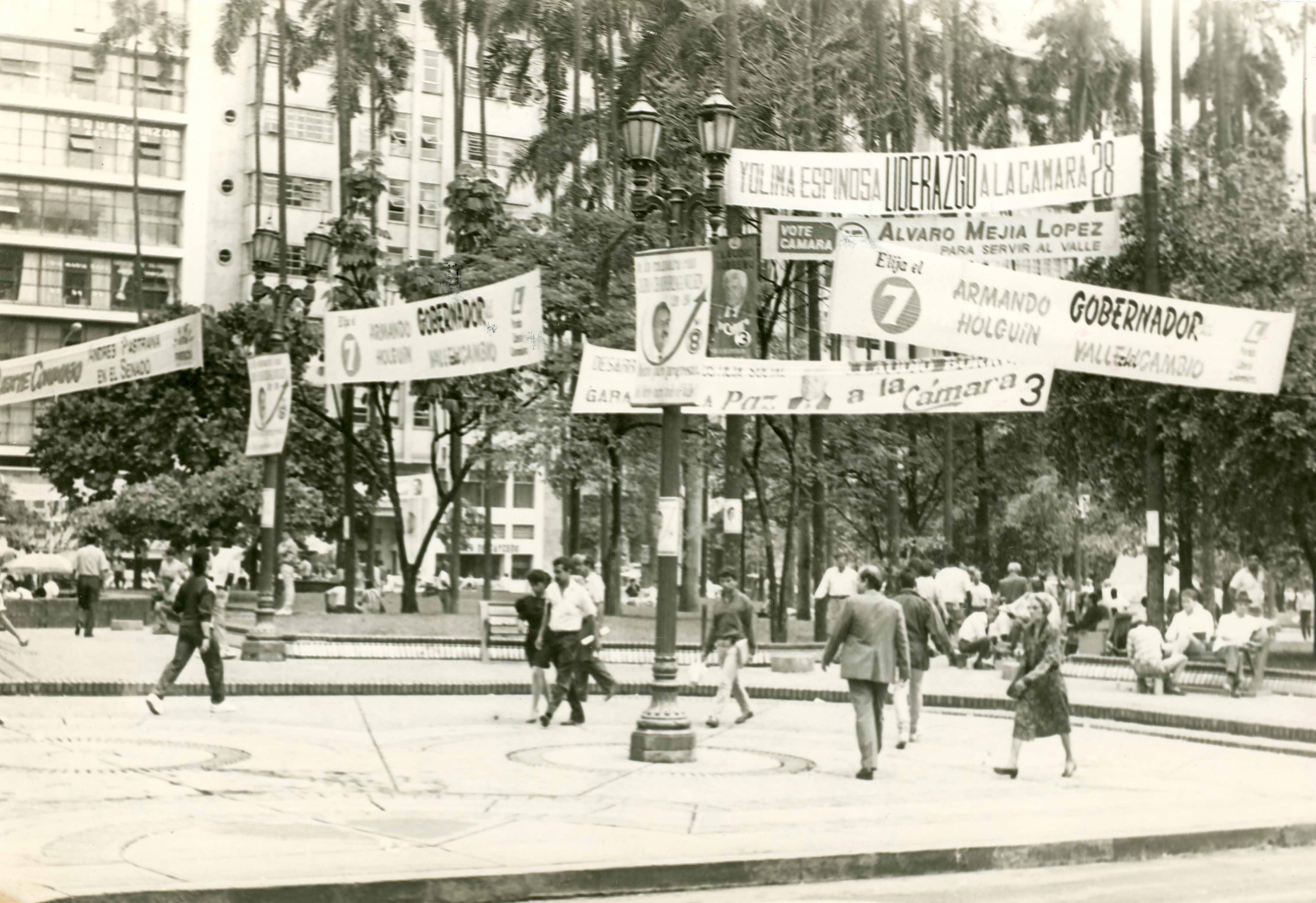 La Plaza de Cayzedo tampoco ha escapado a la polución política, y a menos de un mes de la primera elección popular de gobernador presenta este aspecto deprimente. Casi ninguna palmera ha escapado a la acción de la propaganda electoral. La “guerra de los carteles” se tomó el centro de la ciudad. El Archivo del Patrimonio Fotográfico y Fílmico del Valle del Cauca es responsabilidad de la Biblioteca Departamental del Valle Jorge Garcés Borrero, por convenio de cooperación suscrito con la Secretaría de Cultura Departamental, con el fin de aunar esfuerzos para su conservación, preservación y divulgación del Archivo entre la comunidad Vallecaucana, especialmente entre los estudiantes e investigadores que visitan la Biblioteca, propiciando su uso y consulta permanente. La universidad Icesi es un colaborador en el proceso de difusión, facilitando la tecnología que permite la consulta de las imágenes.