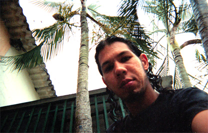 Autorretrato. Toma en contrapicado. Al fondo palmeras y edificación