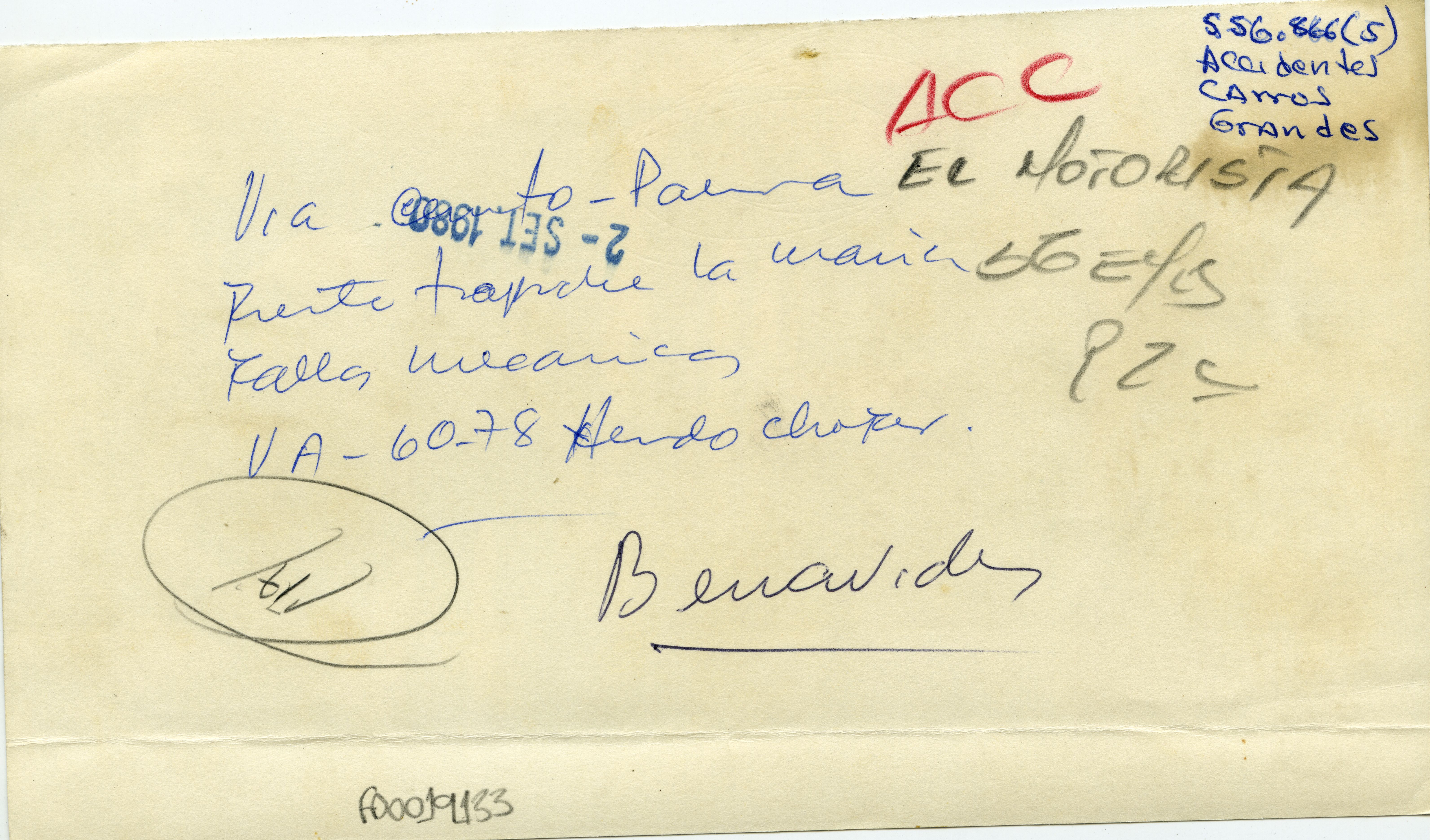 En la fotografía podemos observar un accidente de tránsito en el que un camión, que iba cargado se volcó en la vía Cerrito-Palmira, al parecer el vehículo presentó fallas mecánicas. Al reverso de la fotografía se anexa nota manuscrita: "Vía Cerrito-Palmira. Puente(...) {Ilegible} La María.Falla mecánica. VA-6078 Herido chofer."