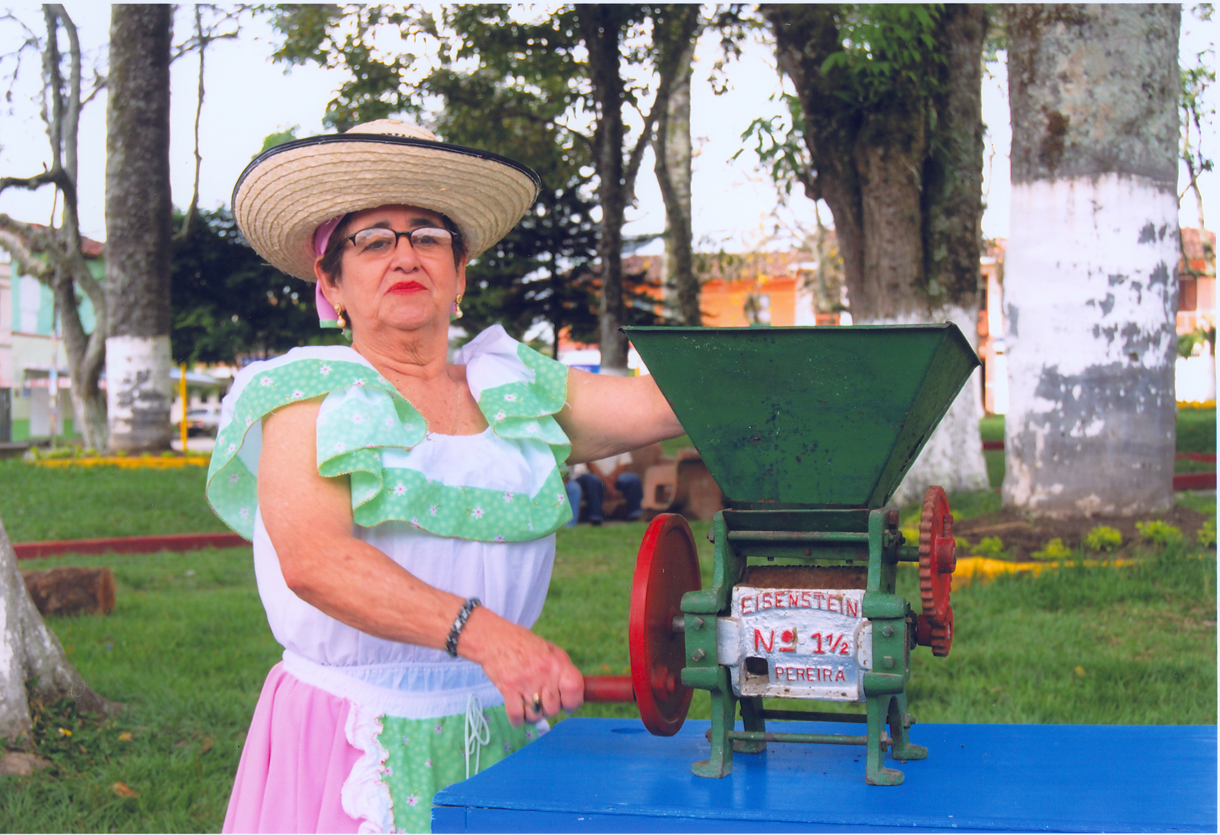 Trujillo, Valle del Cauca. Fundado en 1924, por Leocadio y Rafael Salazar. Nombres: Vernaza. Municipio desde 1930. Economía importante en agricultura, caficultura, ganadería, explotación forestal, entre otros. Atractivo turístico: Iglesias, Charco El Pailón, Monumentos a los Derechos Humanos, Parador El Tablazo. Observamos en la imagen, Rosalba Trujillo con traje típico campesina y máquina despulpadora de café, manual antigua