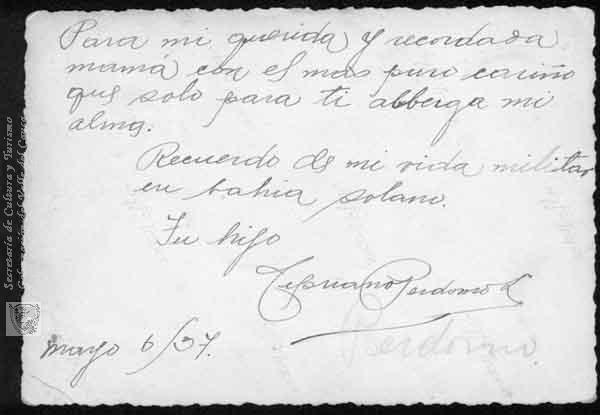 Dedicatoria enviada por Cipriano Persomo a su madre cuando prestaba su servicio militar en Bahía Solano. 1937.