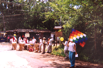 Plano general de jóvenes uniformados practicando murga escolar. Los instrumentos están sobre el camino y el sol brilla sobre ellos. En la parte delantera una joven agita una bandera multicolor.