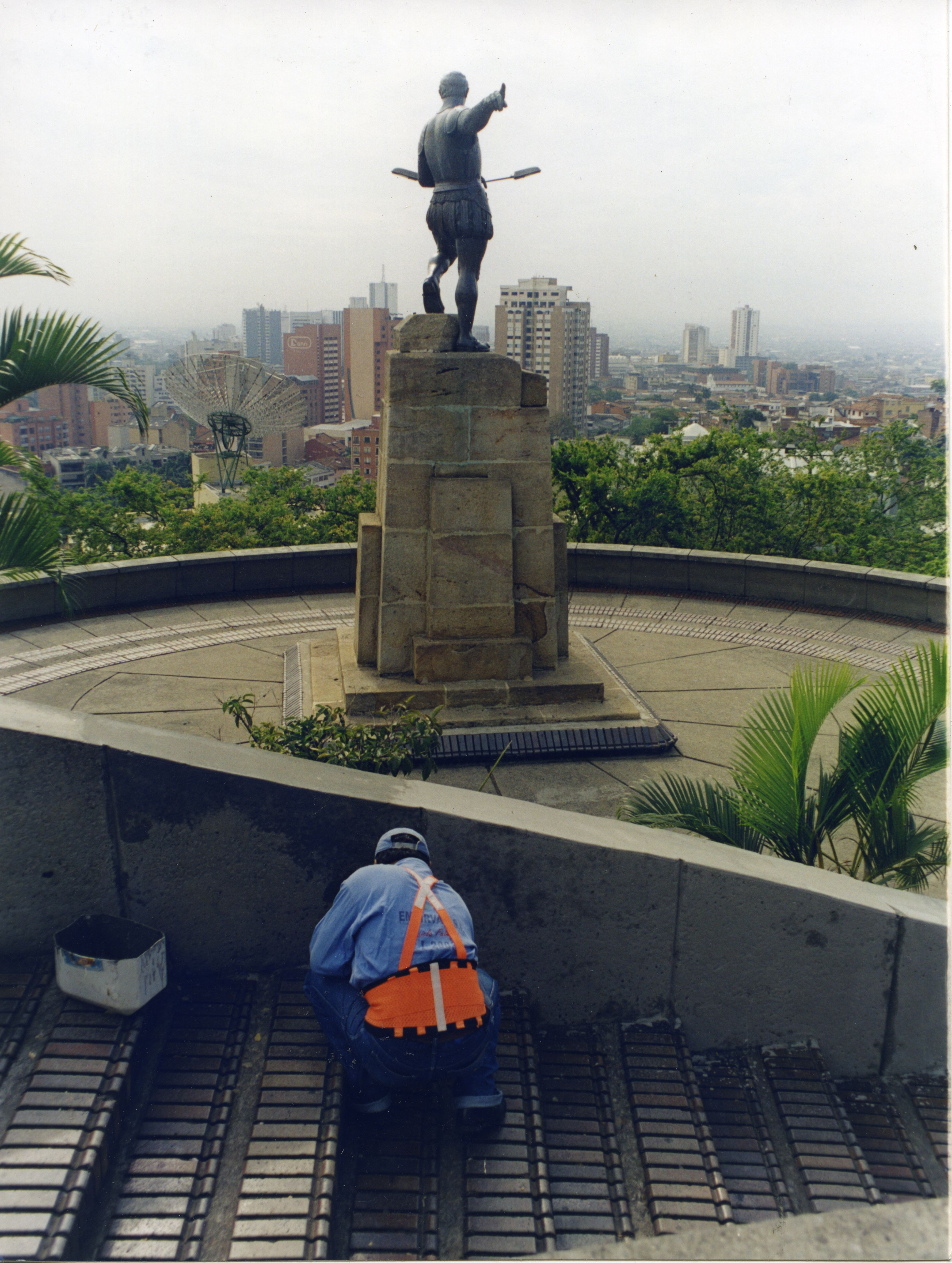 Reverso:"Limpieza a Belalcázar. En desarrollo de la campaña "Cali cogió color" de Emsirva, se llevaron a cabo labores de limpieza en diferentes lugares de la capital vallecaucana. El turno esta vez fue para la estatua de Sebastián de Belalcázar. Estas labores tienen como fin el de embellecer la ciudad para la conmemoración de su aniversario número 467 de fundación, el cual será celebrado mañana con diversos actos"