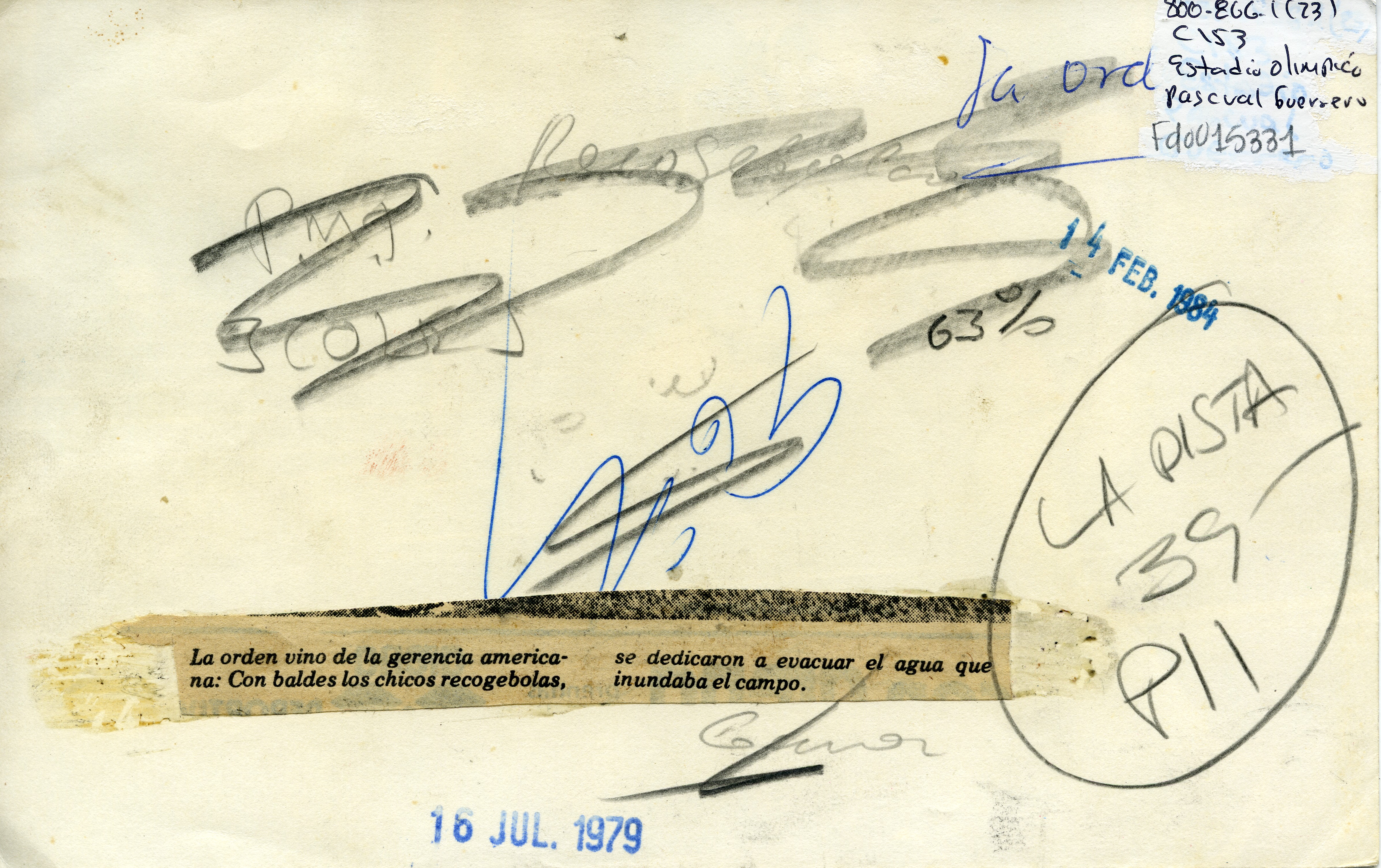 Al reverso de la fotografía se anexa recorte.“La orden vino de la gerencia americana: Con baldes los chicos recogebolas, se dedicaron a evacuar el agua que inundaba el campo.”