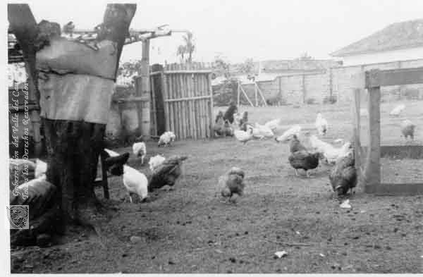 Gallinas en el patio de la familia Londoño Carvajal. En los solares de las casas grandes se acostumbraba tener gallinas, para usarlas en los sancochos que se servían en reuniones familiares u otras festividades. Pradera, 1960.