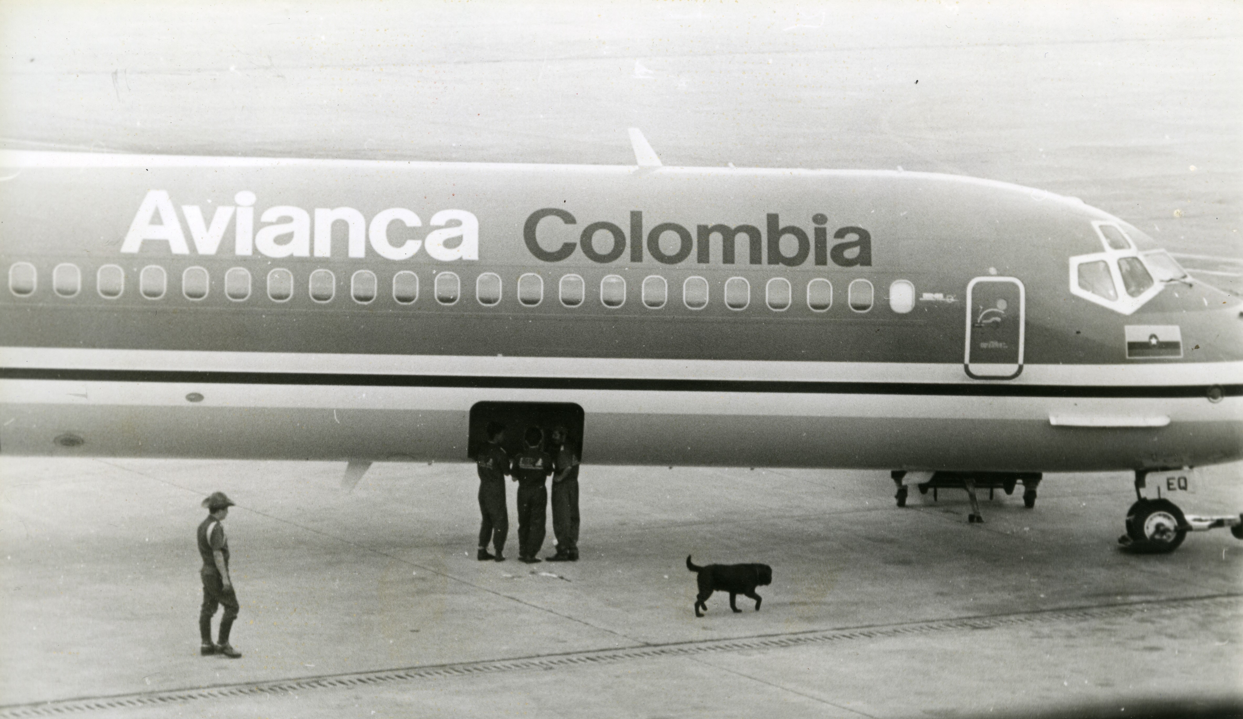 En la pista de aterrizaje del aeropuerto Alfonso Bonilla Aragón, se encuentra estacionado un avión de Avianca Colombia, siendo aparentemente requisado por el personal del aeropuerto. En la fotografía también se observa un caravinero o Policía con un perro. Al reverso dice: Aeropuerto Bonilla Aragón. Perros en busca de coca¨