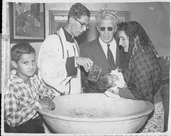 Notese la pila bautismal, elemento que actualmente se usa poco en este tipo de celebración religiosa.