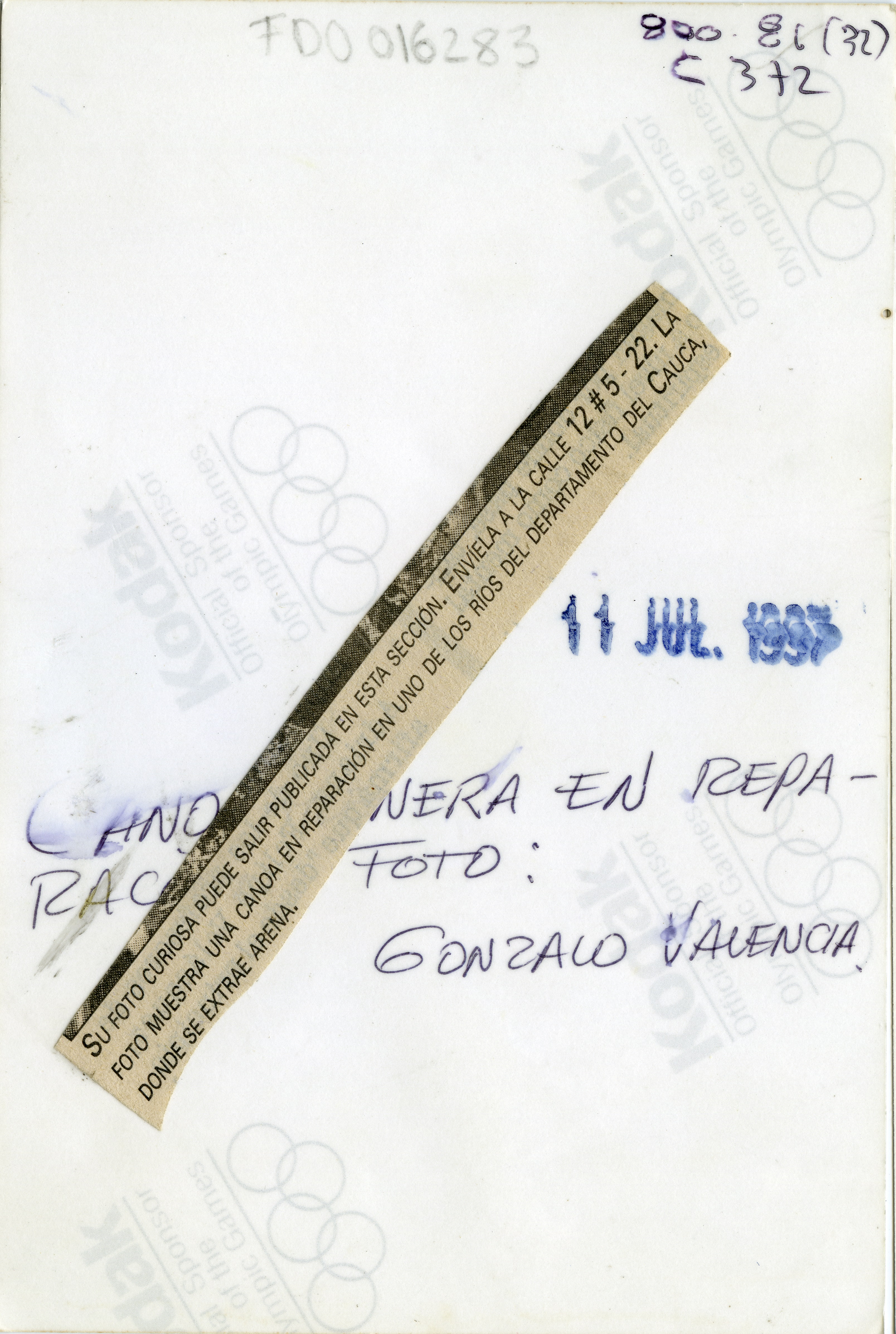 Al reverso de la fotografía se anexa recorte: "Su foto curiosa puede ser publicada en esta sección. Envíela a la Calle 12#5-22. La foto muestra una canoa en reparación en uno de los Ríos del Departamento del Cauca, donde se extrae arena.