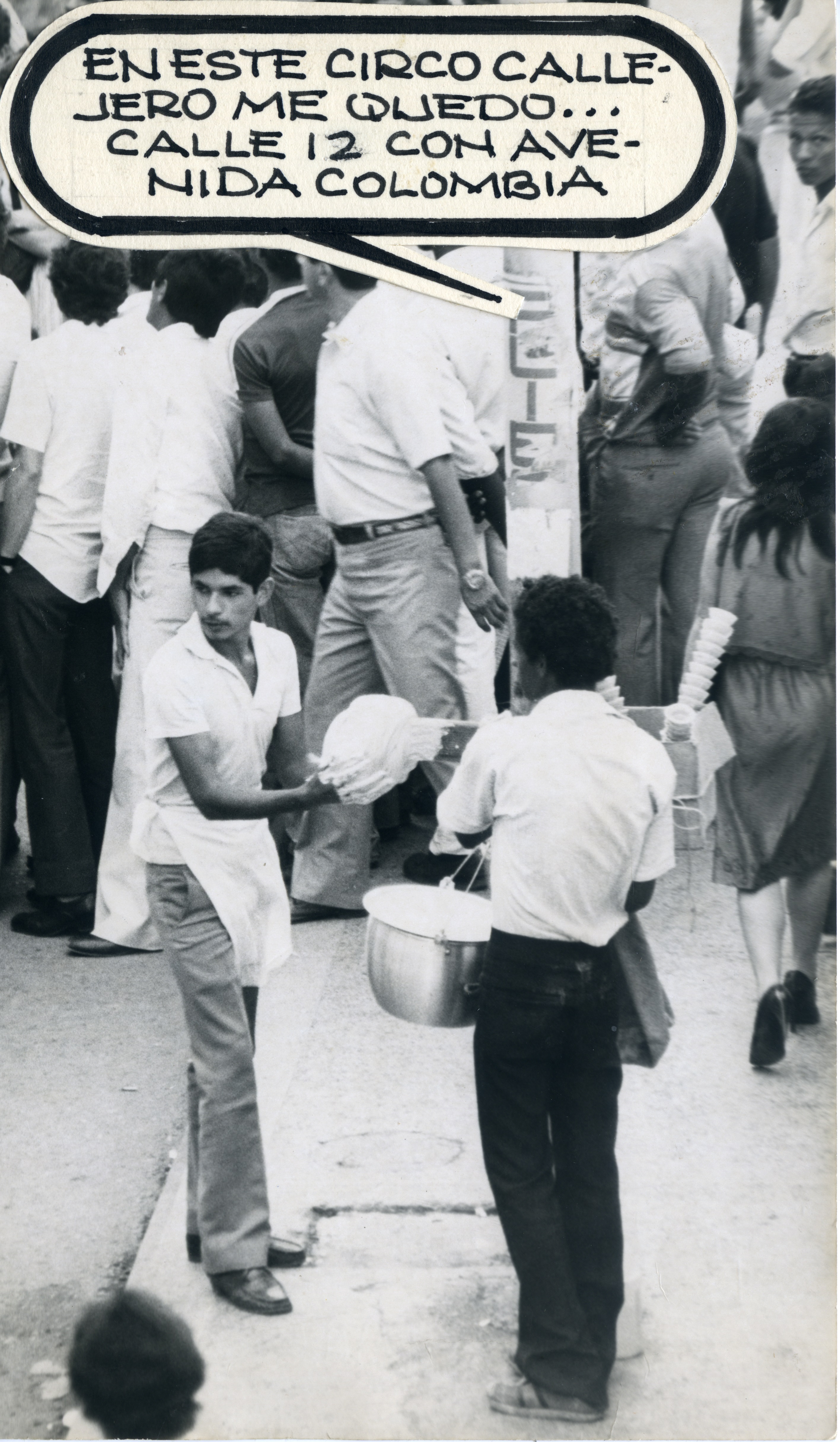 Venta de conos de gelatina en la zona peatonal de la Calle 12 con Cra. 1a y 3a. El dulce de la gelatina se manipula en un tronco de madera atado a un poste. La foto se se titula, según su autor, como "en este circo me quedo".