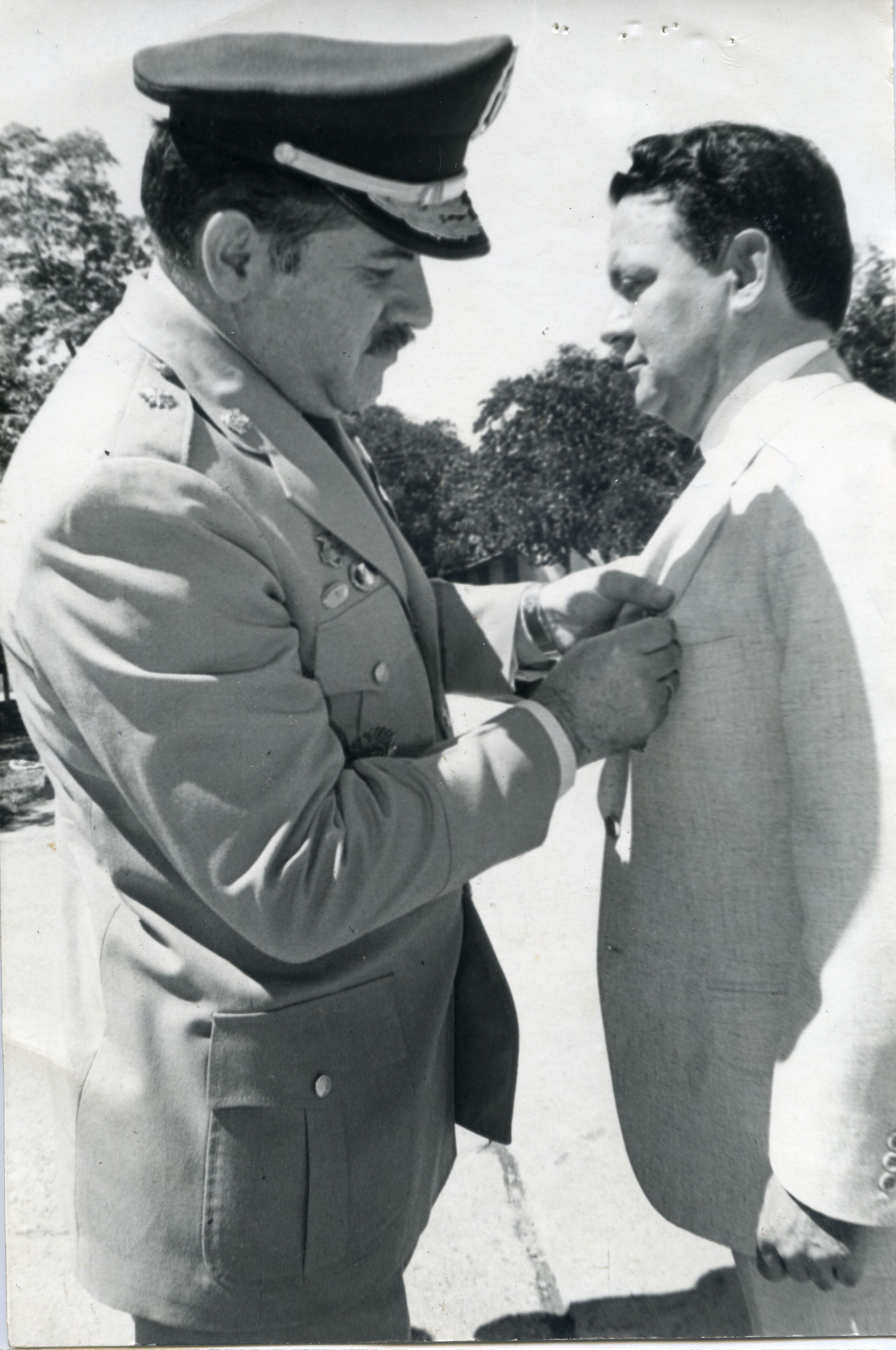 En la fotografía podemos observar al señor Humberto González Narváez siendo condecorado por un brigadier del ejercito del municipio de Cartago.