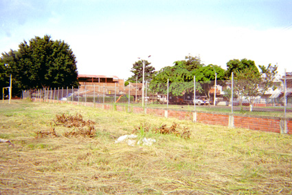 Plano General. Se destaca una zona verde en el extremo inferior. En la parte superior un muro de ladrillo con reja define una diagonal hacia la izquierda. Al fondo un parque con vegetación abundante y la fachada de algunas viviendas.