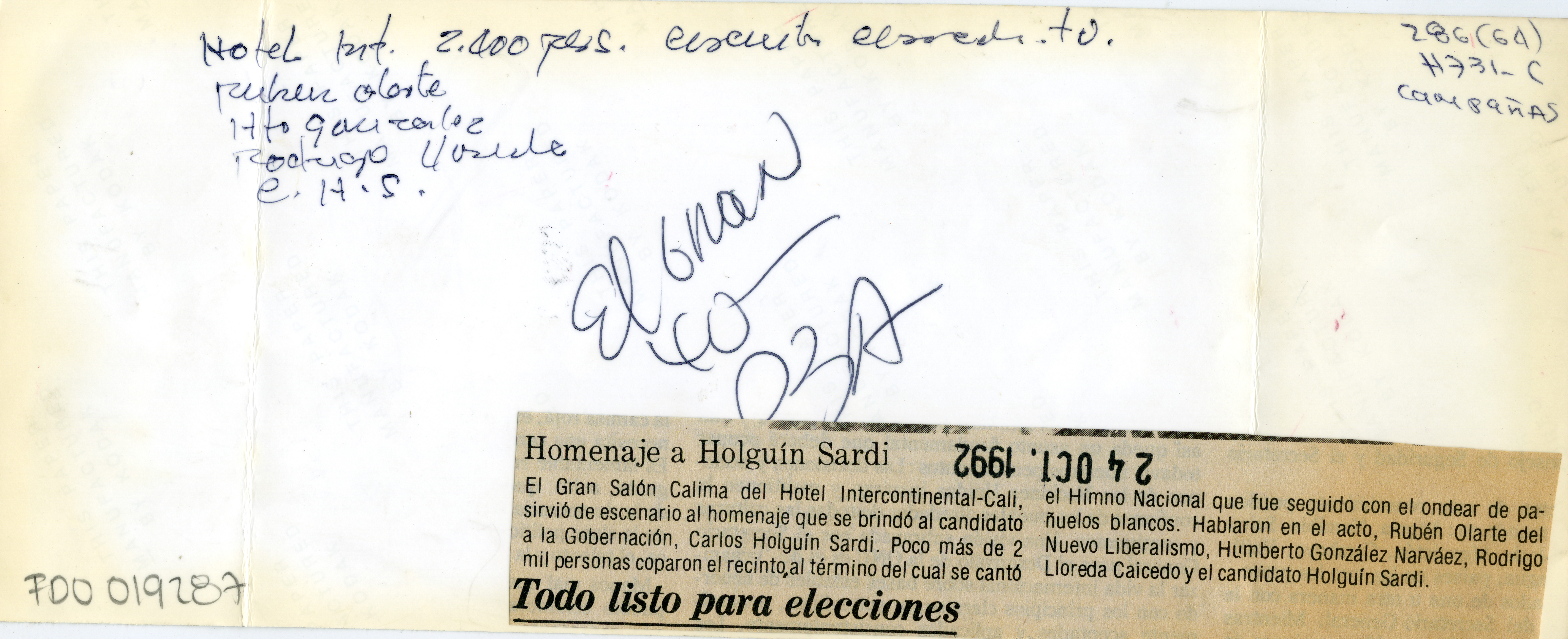 | dc.description.abstract | En la fotografía podemos observar a un gran número de personas reunidas en el Hotel Intercontinental de la ciudad se Cali, seguidores de Holguín Sardi. Este evento fue un homenaje que se hizo al candidato de la Gobernación Carlos Holguín Sardi. Al reverso de la fotografía se anexa recorte: "Homenaje a Holguín Sardi. El Gran Salón Calima del Hotel Intercontinental-Cali, sirvió de escenario al homenaje que se brindó al candidato a la Gobernación, Carlos Holguín Sardi. Poco más de 2 mil personas coparon el recinto al término del cual se cantó el Himno Nacional que fue seguido con el ondear de pañuelos blancos. Hablaron en el acto, Rubén Olarte del Nuevo Liberlismo, Humberto Gonzáles Narváez, Rodrigo Lloreda Caicedo y el candidato Holguín Sardi." | spa |