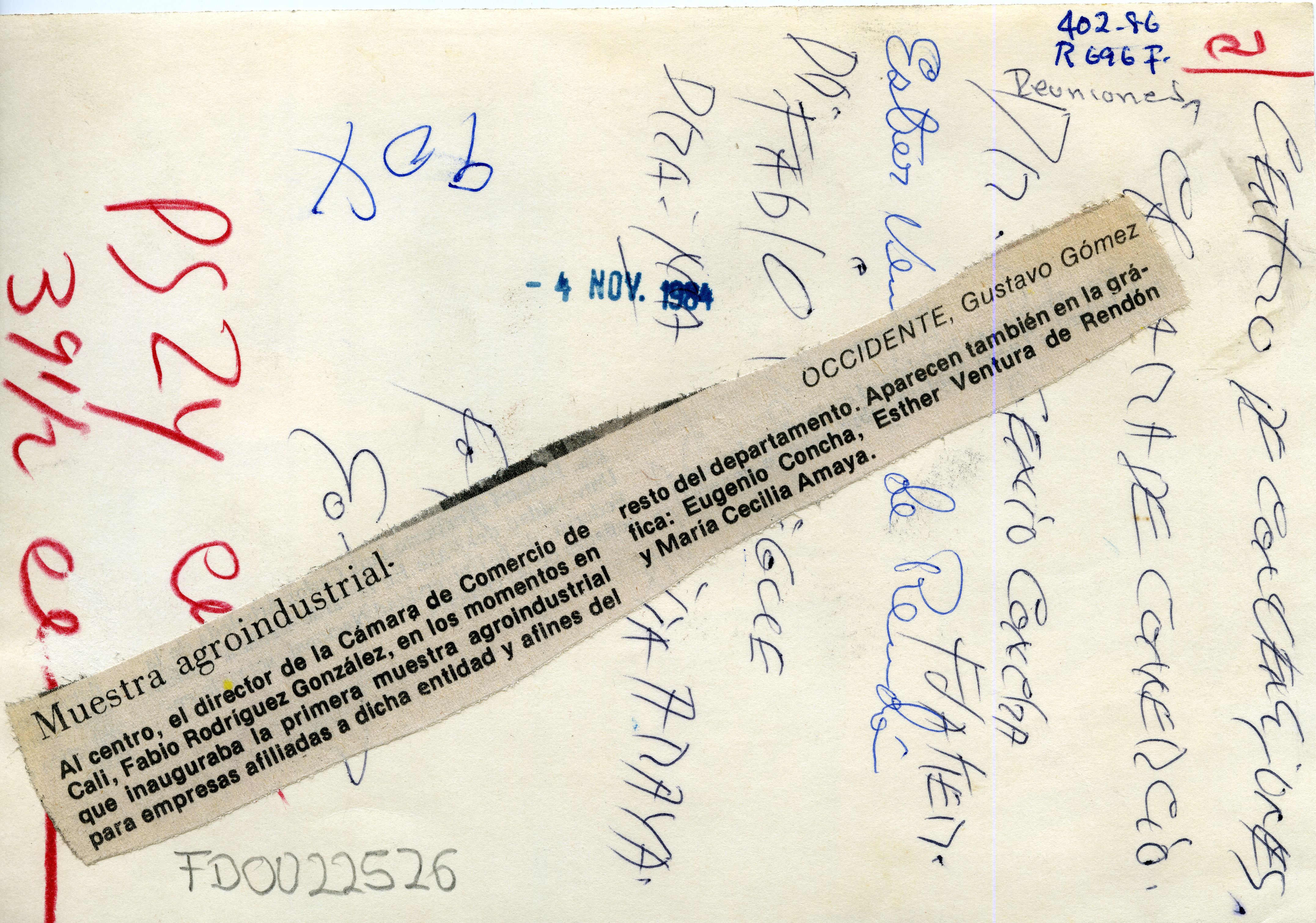 Al centro, el director de la Cámara de Comercio de Cali, Fabio Rodríguez González, en los momentos en que inauguraba la primera muestra Agroindustrial para empresas afiliadas a dicha entidad y afines del resto del departamento aparecen también en la gráfica: Eugenio Concha, Esther Ventura de Rincón y María Cecilia Amaya