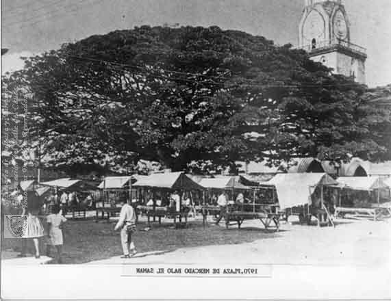 Día de mercado en el parque principal de Alcalá. C. 1960.
