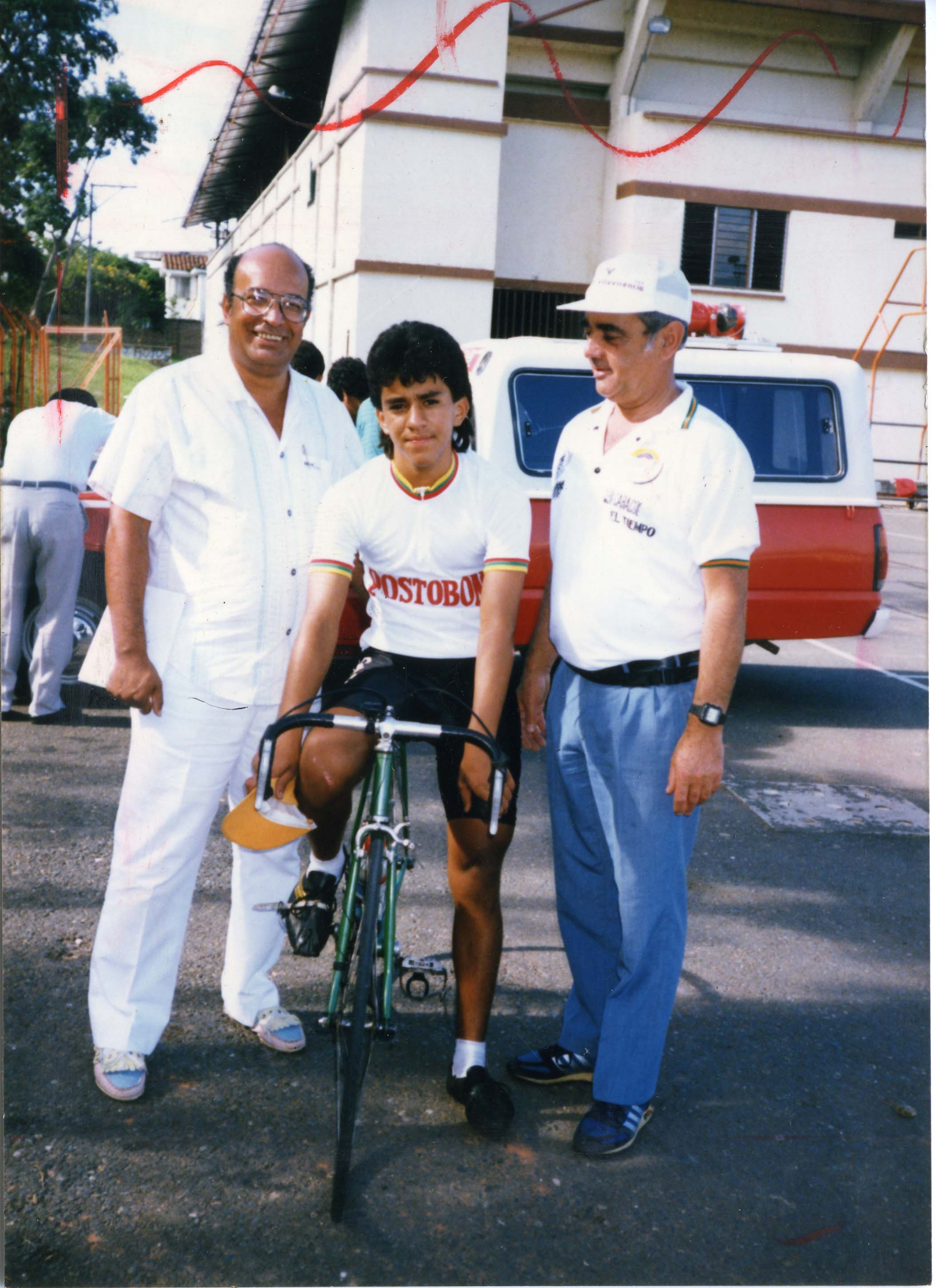 Al reverso de la fotografía dice: Giovanni Alberto García, ciclista que se proyecta para pruebas de caracter nacional e internacional, quien participó en la reciente vuelta al Valle ocupando la décima posición. Giovanni se proyecta como el mejor ciclista bugueño en la categoría juvenil y actualmente se prepara para la próxima vuelta de la Juventud. Lo acompañan el profesor Jor Smith, asesor de las escuelas de ciclismo de Colombia, y Oscar Vergara, patrocinador de la Escuela Panela El Triunfo.