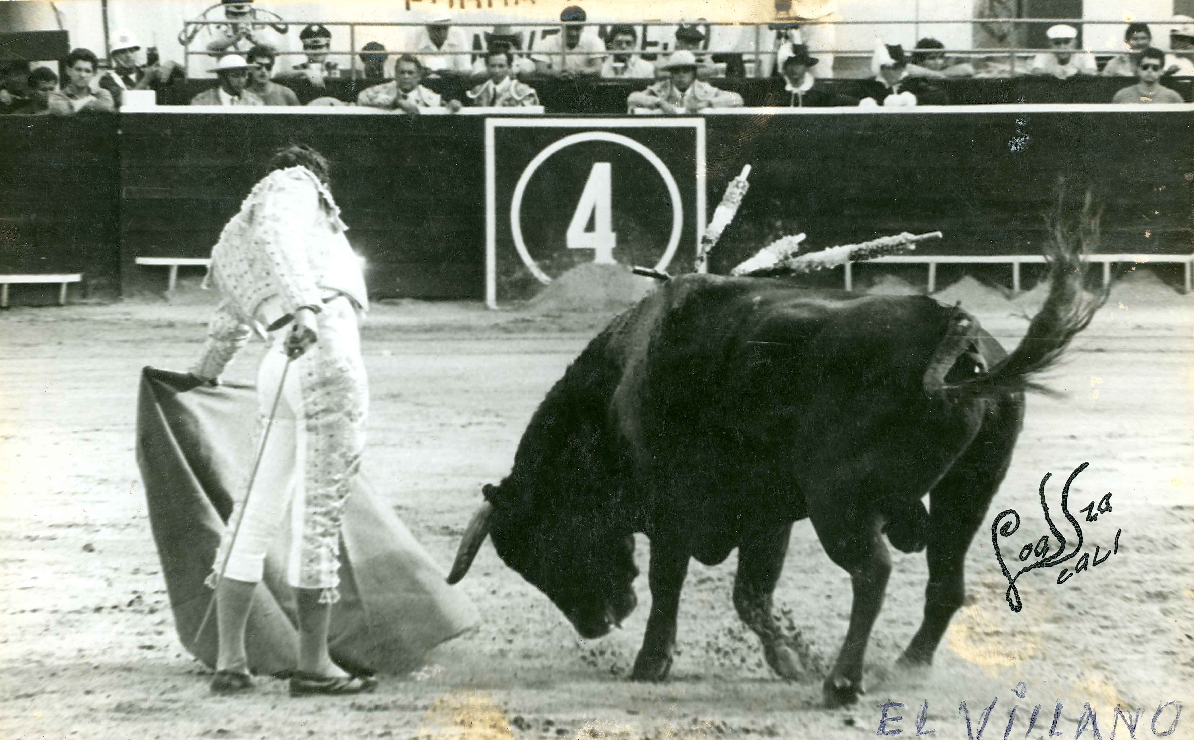 Se observa torero realizando uno de sus pases al toro, al fondo se logra ver algunos espectadores