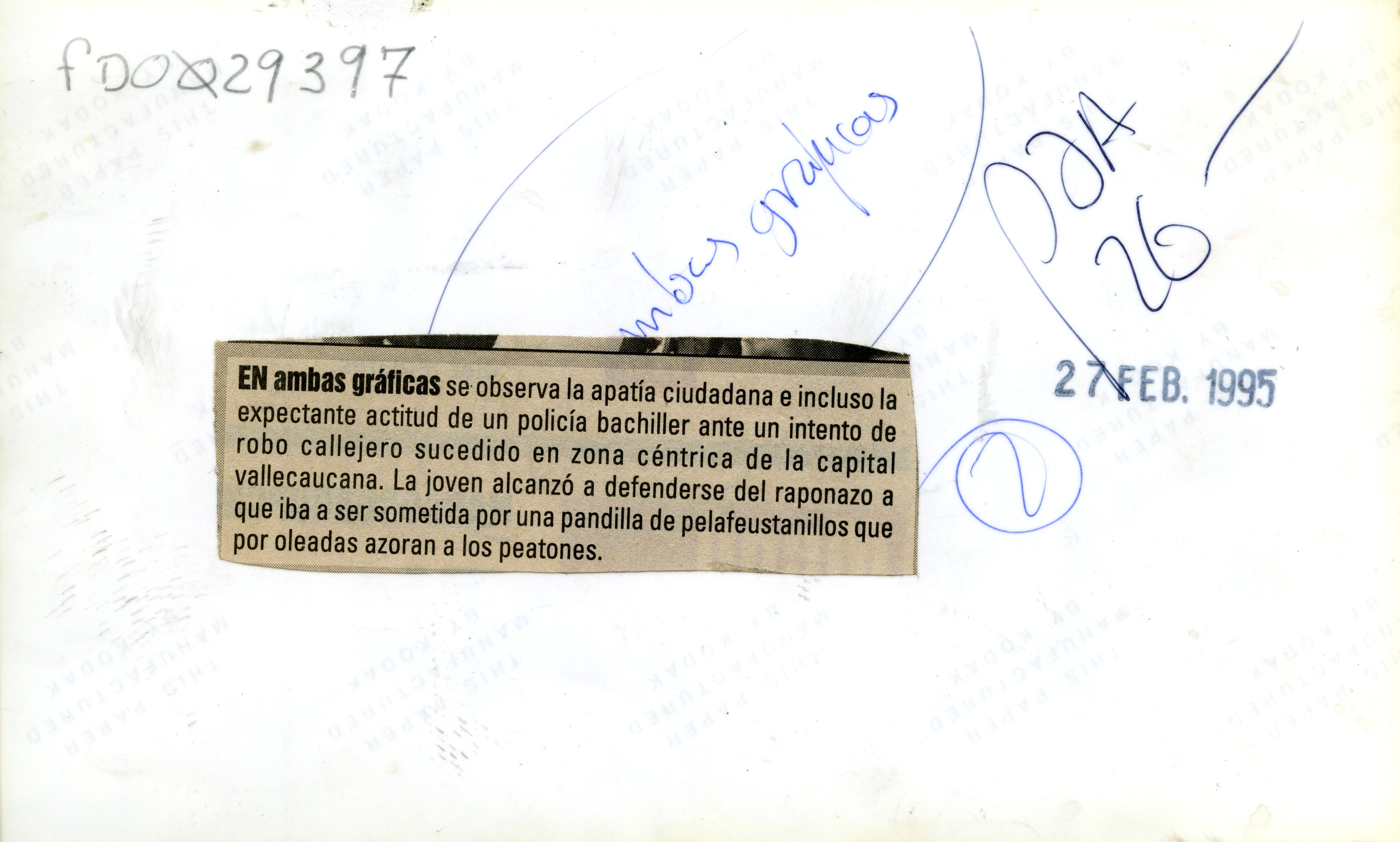 En ambas gráficas se observa la apatía ciudadana e incluso la expectante actitud de un policía bachiller ante un intento de robo callejero sucedido en zona céntrica de la capital vallecaucana. La joven alcanzó a defenderse del raponazo al que iba a ser sometida por una pandilla de pelafeustanillos que por oleadas azoran a los peatones.