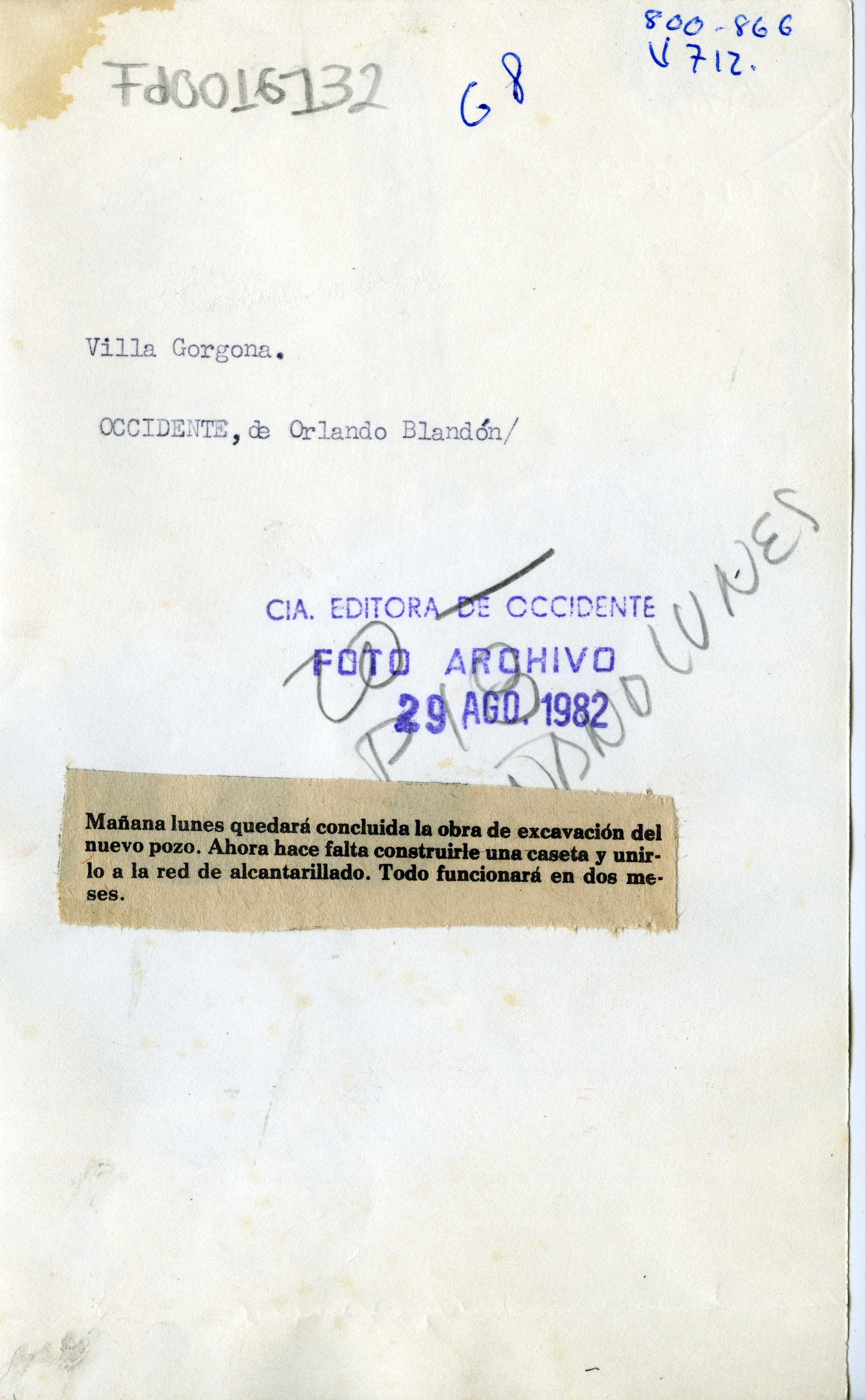 Al reverso de la fotografía se anexa recorte: "Mañana lunes quedará concluida la obra de excavación del nuevo pozo. Ahora hace falta construirle una caseta y unirlo a la red de alcantarillado. Todo funcionará en dos meses."