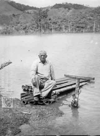 José Mario Echeverry García sentado en su balsa a la orilla de la laguna. Dagua, 1940.