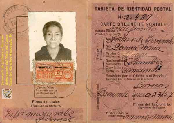 Tarjeta de Identidad postal de Juana María Gómez de Hernández. expedida por la oficina de correos. Jamundí, C. 1957.