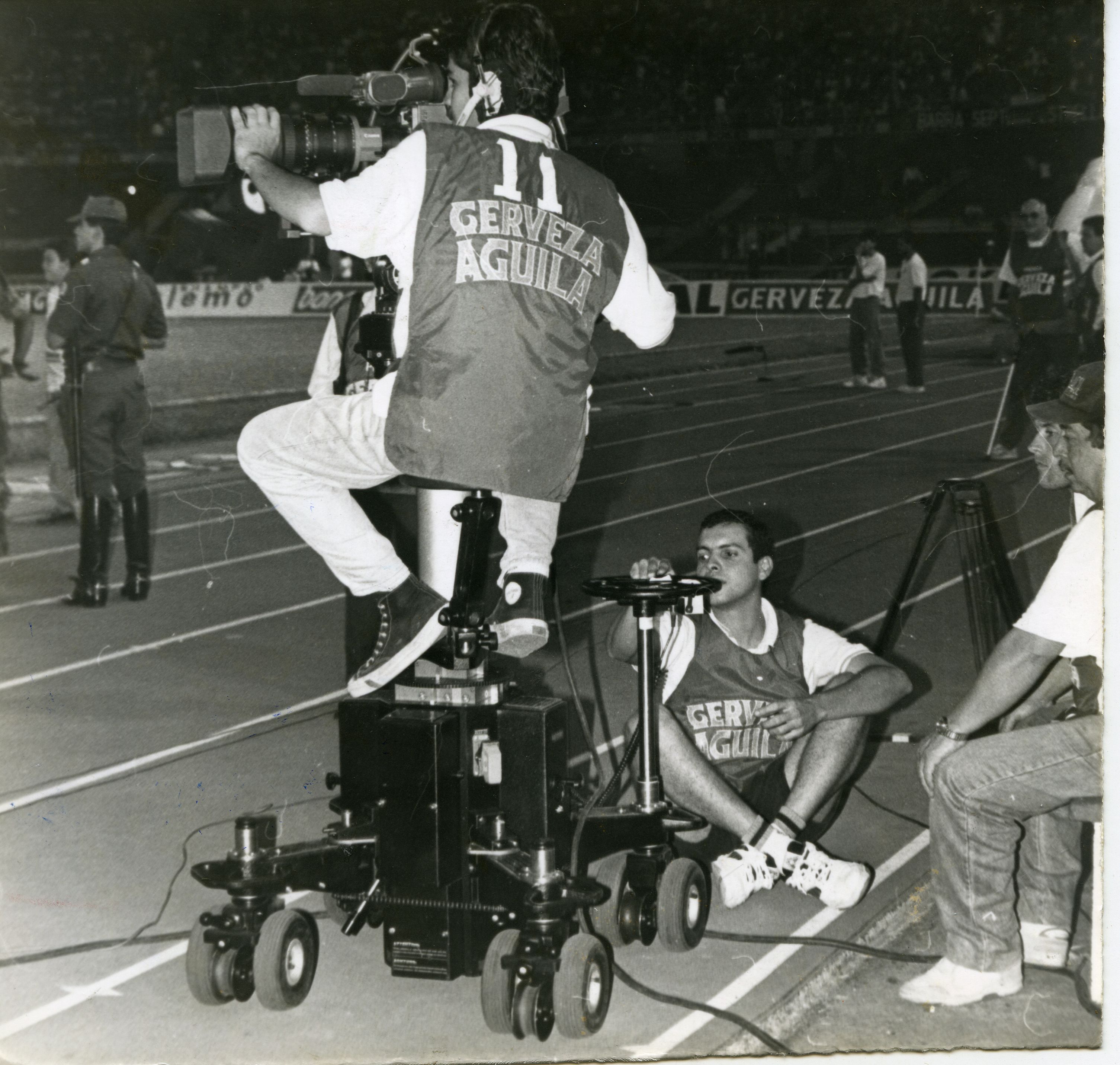 Camarógrafo de Caracol televisión en el estadio del Pascual Guerrero cubriendo un evento deportivo.