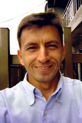 Primer Plano. Imagen tomada en exterior, donde se destaca el rostro de un hombre joven, con una sonrisa en su rostro. Está vestido con camisa de color azul. Al fondo la fachada de una vivienda de dos plantas con una reja de color café a la entrada de ésta.