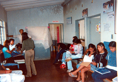 Interior de centro juvenil. Varios jóvenes se encuentran sentados, con cuadernos y en actitud de estudio. Un señor se encuentra parado observándolos con un papelógrafo dispuesto. Paredes del recinto pintadas de azul claro.