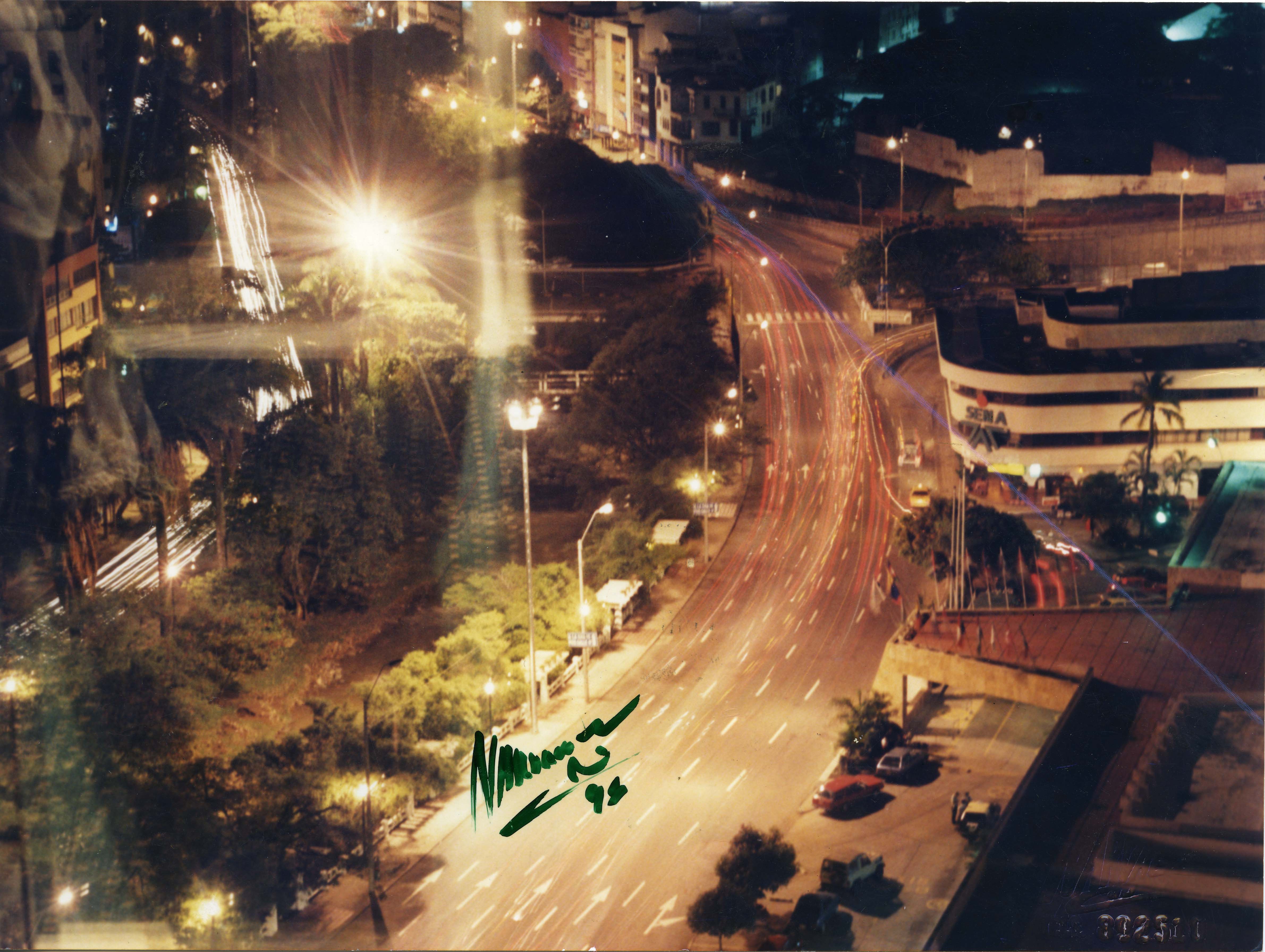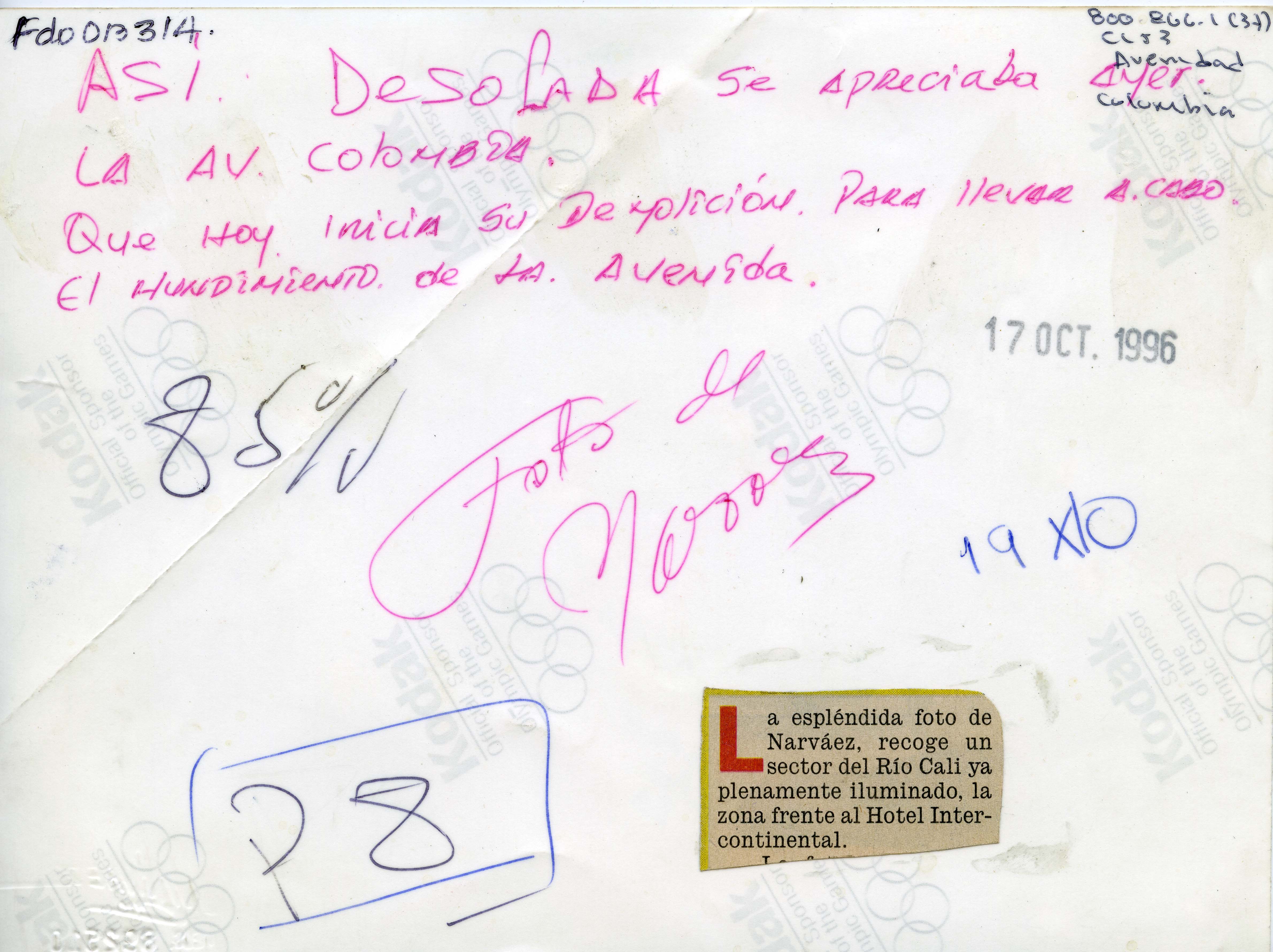 Al reverso de la fotografía se anexa el recorte."La espléndida foto de Narváez, recoge un sector del Río Cali ya plenamente iluminado, la zona frente al Hotel Intercontinental".