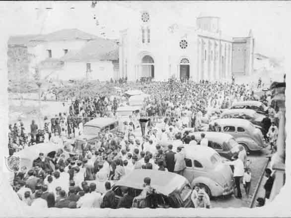 Multitudinaria asistencia una ceremonia religiosa, Iglesia y plaza principal de La Unión. C. 1940