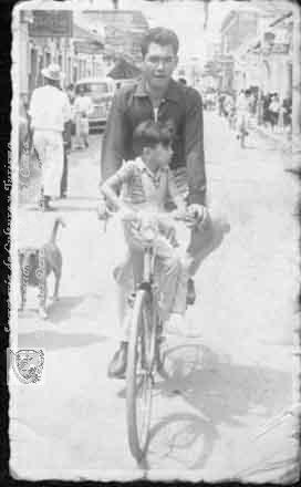 Paseo en bicicleta por el centro de la ciudad. La bicicleta fue el medio de transporte más popular que se utilizó para ir al trabajo, a los pueblos vecinos, para hacer las comparas, o ir a pasear con los amigos. Lugar por identificar, 1955.