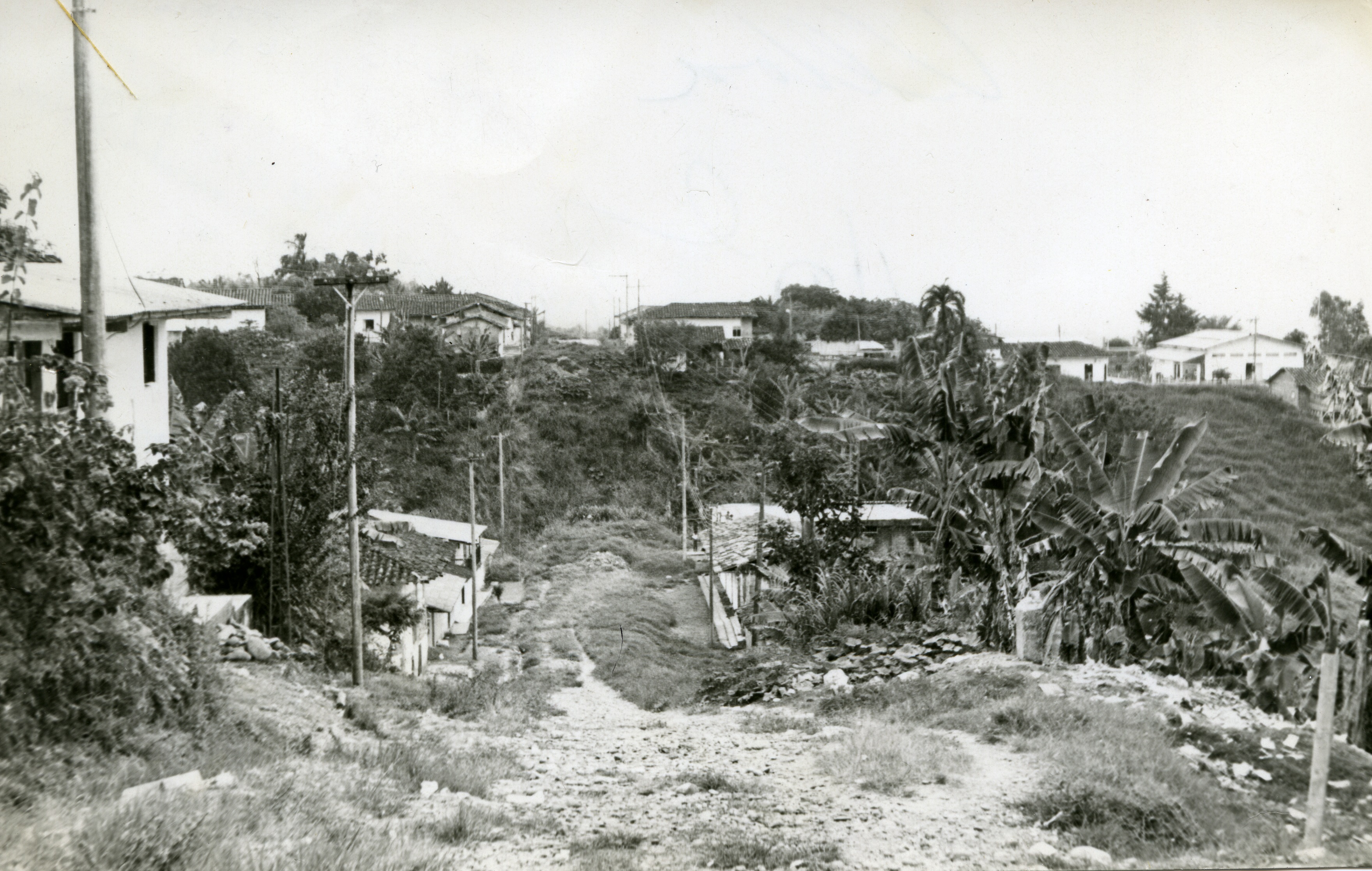 Fotografía tomada desde la parte superior de la carretera. Carretera sin pavimentar, de lado a lado se pueden ver algunas casas y plantas de plátano