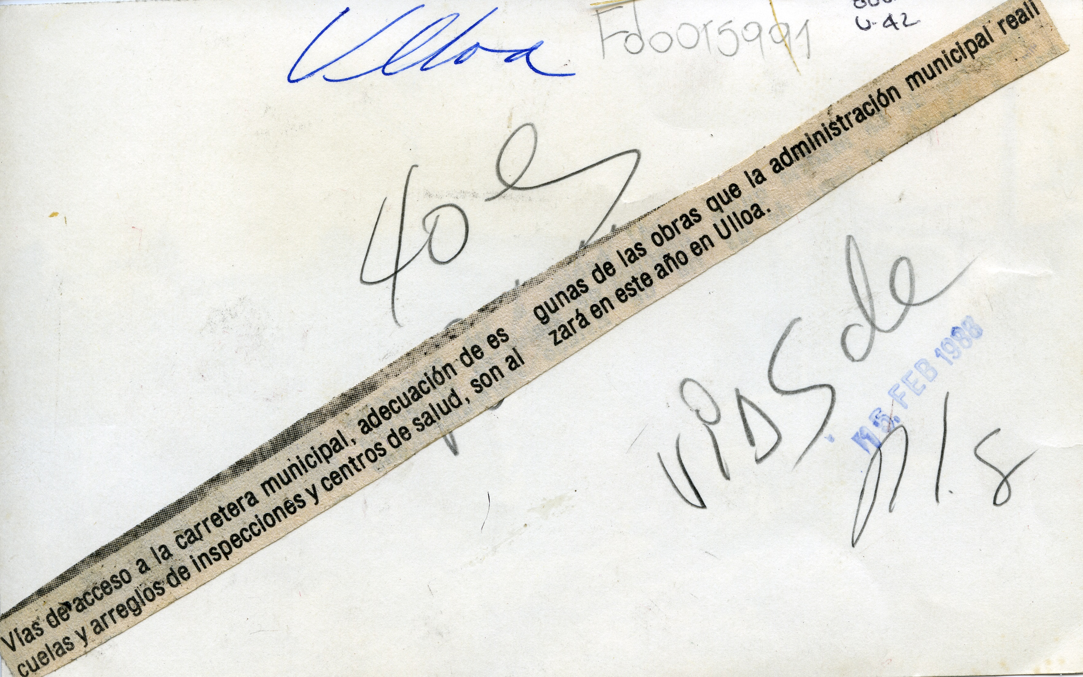 Al reverso de la fotografía se anexa recorte: "Vías de acceso a la carretera municipal, adecuación de escuelas y arreglos de inspecciones y centros de salud, son algunas de las obras que la administración municipal realizará en esta año en Ulloa "