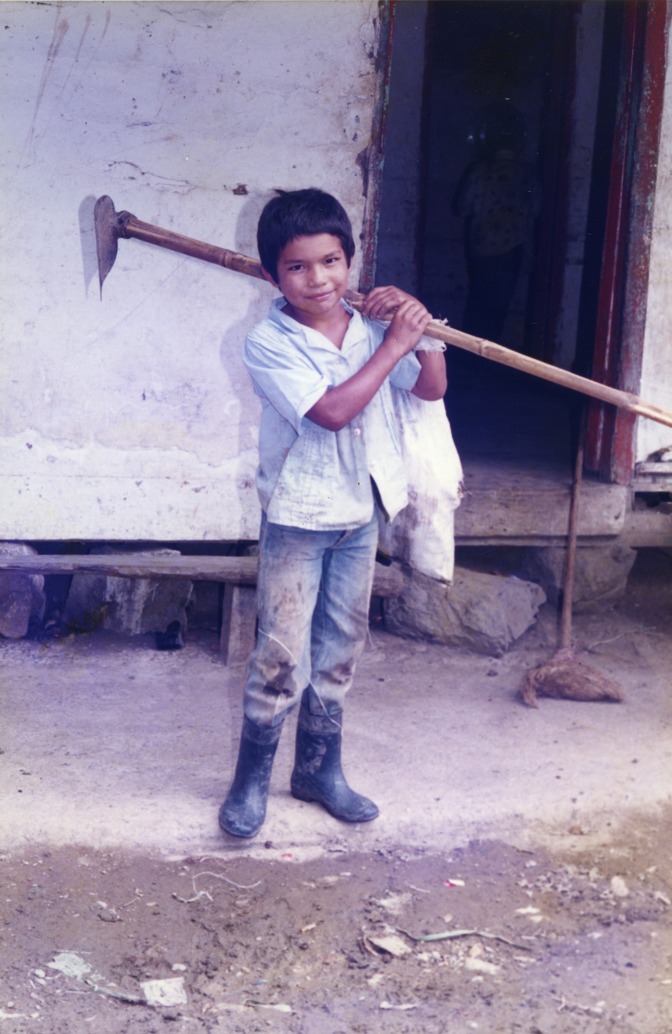 Niño campesino de El Dovio cargando una de las herramientas de las labores del campo.