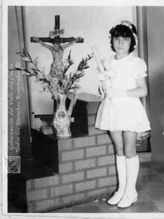 Celebración de la primera comunión. Nótese la altura del vestido de ceremonia, acorde con la moda de la época. Caicedonia, 1970.