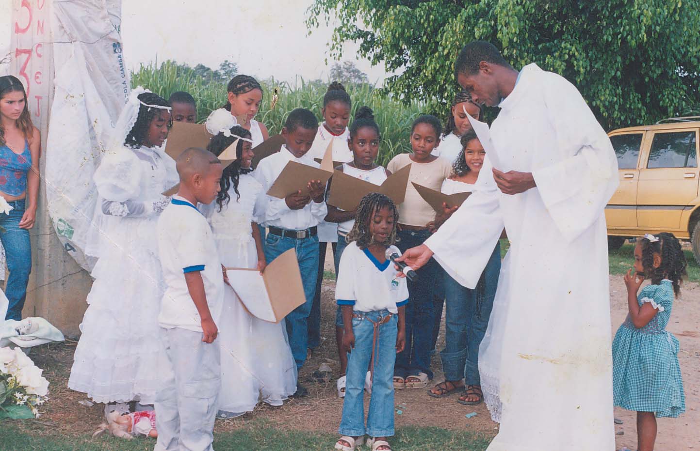 Jamundí, Valle del Cauca. Fundado en 1536, por Juan de Ampudia y Pedro de Añazco. Nombres: Villa de Ampudia, Rosario, Río Claro. Economía importante en agricultura, ganadería, minería, comercio, entre otros. Atractivo turístico: Parque Artesanal del Cholado, Nuestra Señora del Rosario, Balsaje Río Cauca, Museo Arqueológico. Observamos en la imagen, primeras comuniones en el corregimiento de Bocas del Palo. Se aprecia al sacerdote con los niños