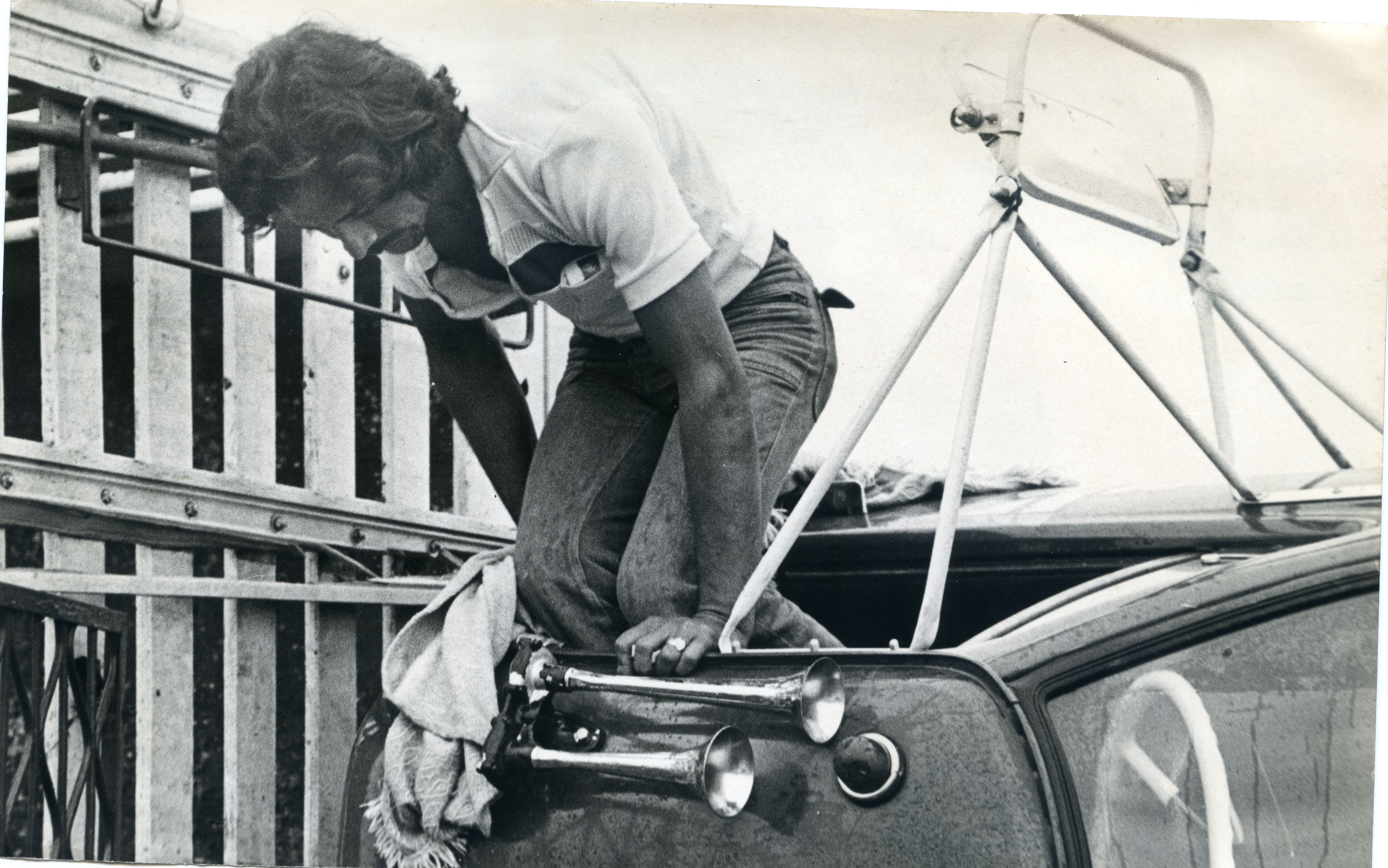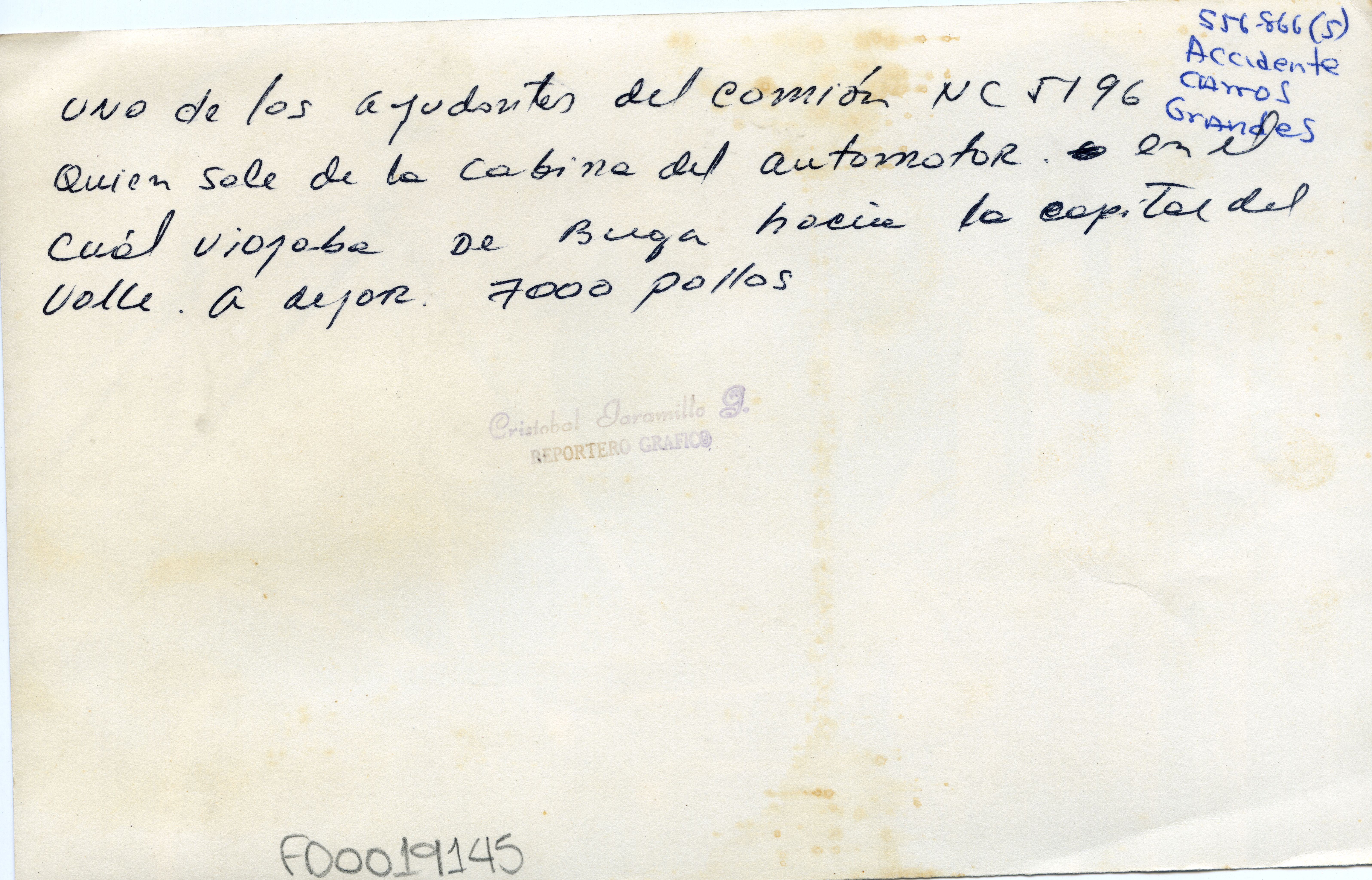 En la fotografía podemos apreciar a un hombre, el cual es el ayudante del conductor, saliendo de la cabina de un camión que acaba de volcarse. El vehículo de placas NC-5196 viajaba de Buga hacia la capital del Valle. Al reverso de la fotografía se anexa nota manuscrita: "Uno de los ayudantes del camión NC 5196 quien sale de la cabina del automotor, en el cual viajaba de Buga hacia la capital del Valle a dejar 7000 pollos".