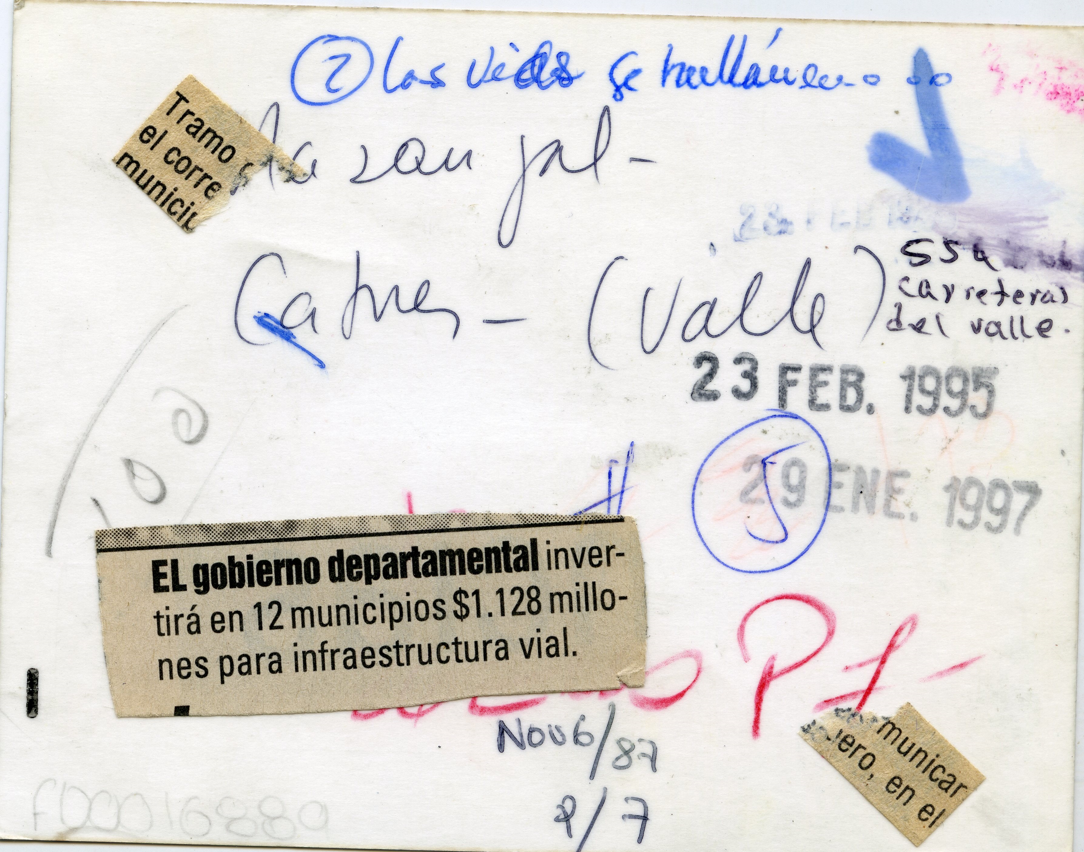 Al reverso de la fotografía se anexa recorte de prensa: "El gobierno departamental invertirá en 12 municipios $1,128 millones para infraestructura vial."