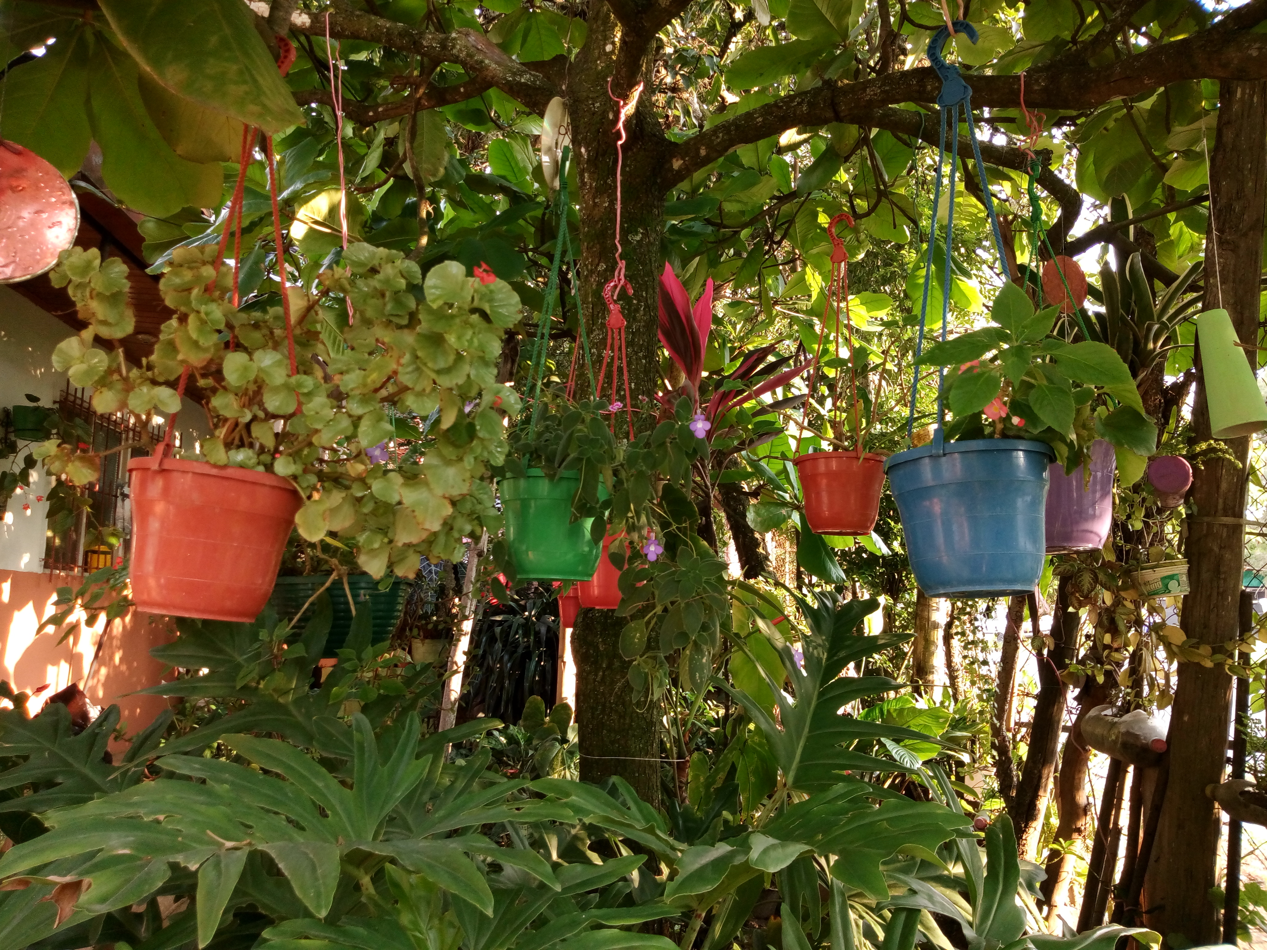 Se observa un árbol con materas de colores colgando de sus ramas. Alrededor plantas y en el fondo a la izquierda una casa.