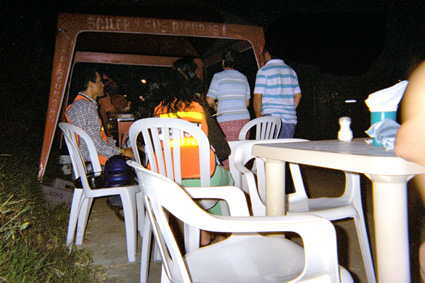 Plano Medio. Imagen donde se destaca un grupo de personas sentadas en unas mesas de color blanco en un restaurante ubicado en exterior. Se destaca especialmente una mujer sentada en una silla con un chaleco reflectivo que contrasta con el fondo oscuro.