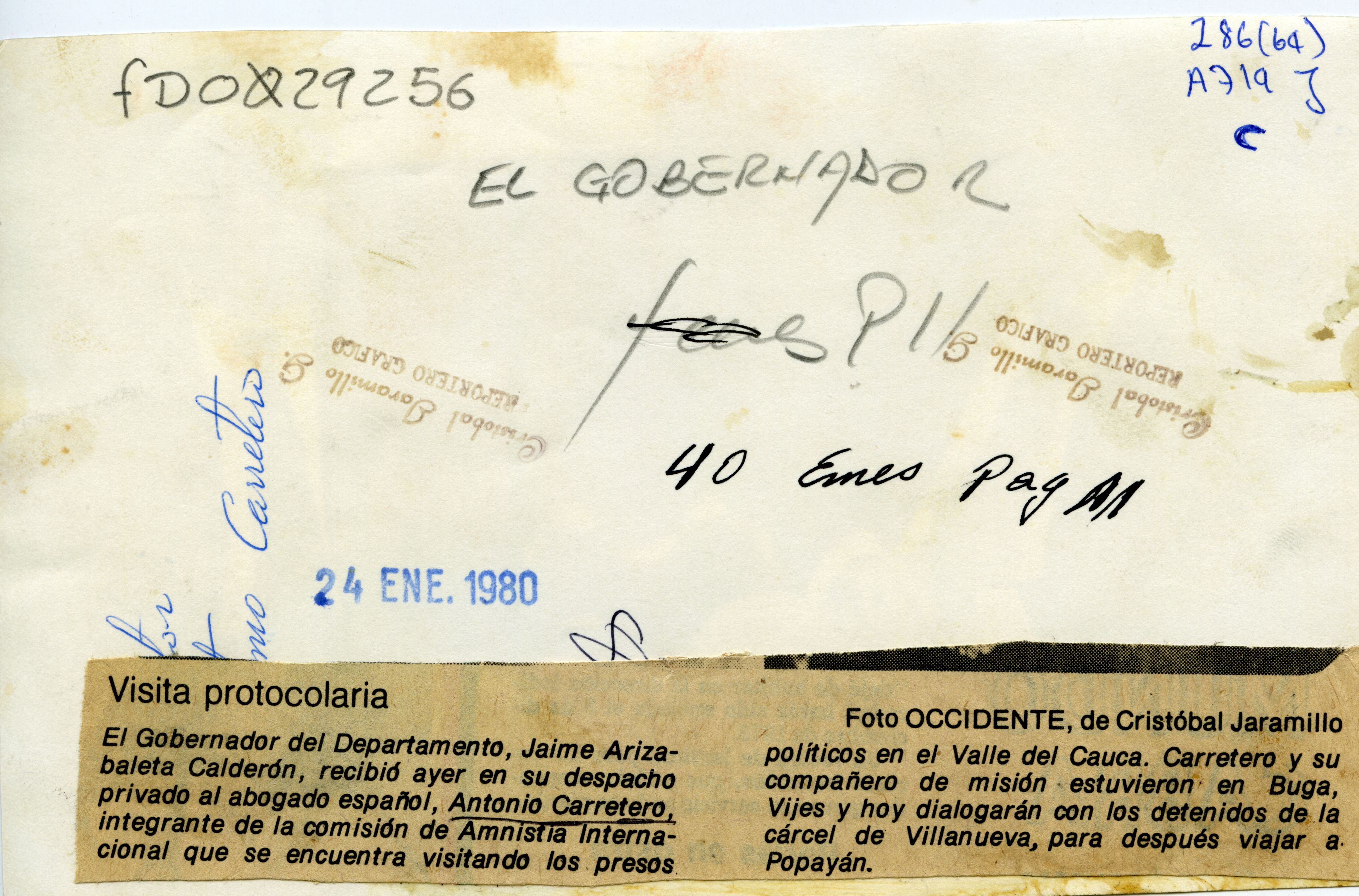 Jaime Arizabaleta Calderón fue gobernador del valle en el periodo del 1 de septiembre de 1978 al 11 de septiembre de 1980. Perteneció al partido Liberal Colombiano. Se observa Jaime Arizabaleta Calderón, junto con el abogado Antonio carretero integrante de la comisión de amnistía internacional que se encuentra visitando los presos politicos en el valle del Cauca.