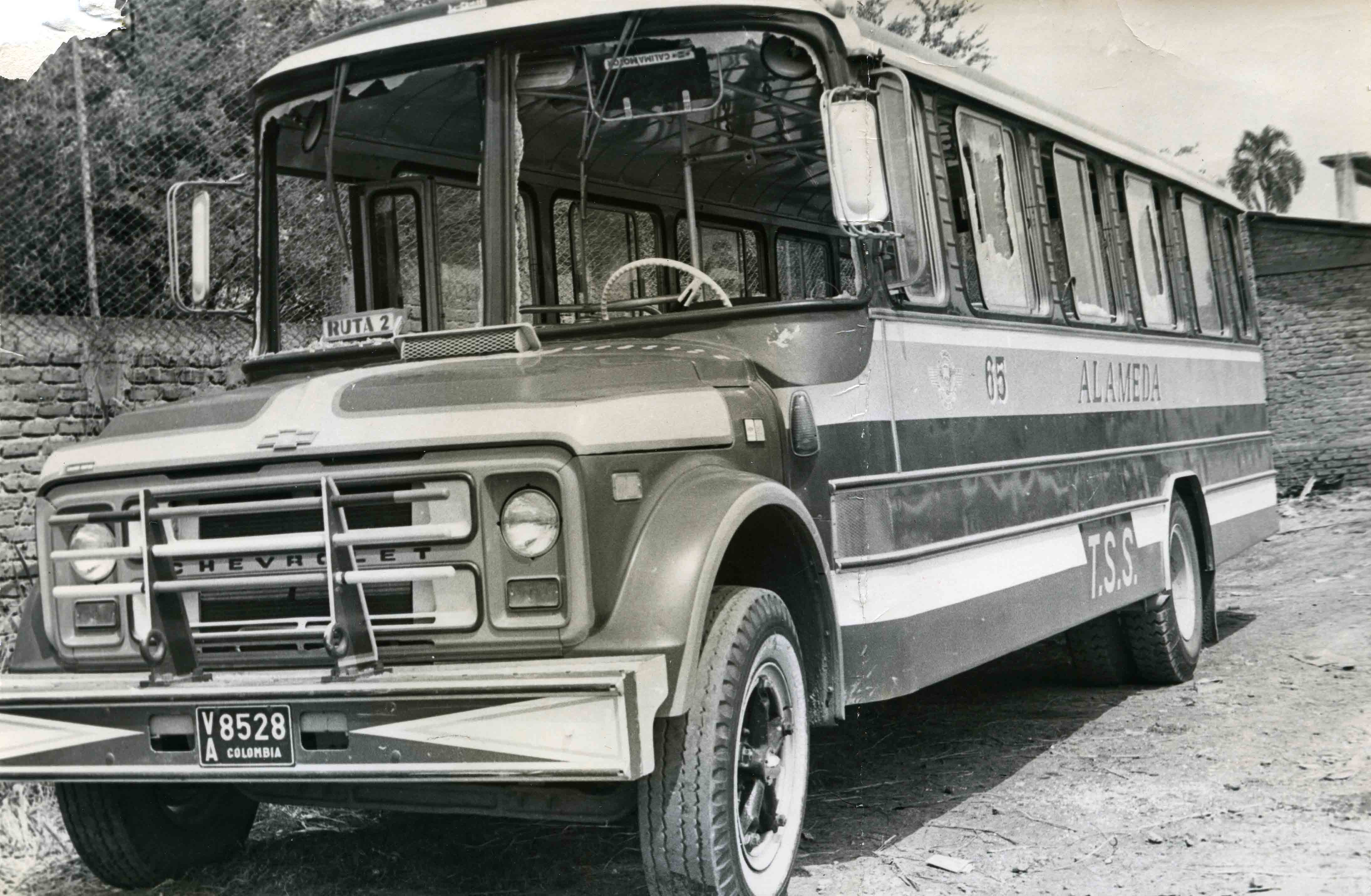 El TSS que aparece en la gráfica de placas VA-85-28, de la empresa Alameda, fue apedredo por estudiantes del inem de la carrera 5a, con calle 60. Los daños fueron evaluados en sesenta mil pesos. El conductor, Gerardo Marcial, sufrió heridas en la ceja derecha con una esquirla de uno de los vidrios rotos. Fue atendido en el hospital departamental. La policía no informó los móviles que originaron los desórdenes. Por este hecho no hay detenidos. El bus está avaluado en cuatro y medio millones de pesos. El Archivo del Patrimonio Fotográfico y Fílmico del Valle del Cauca es responsabilidad de la Biblioteca Departamental del Valle Jorge Garcés Borrero, por convenio de cooperación suscrito con la Secretaria del Cultura Departamental, con el fin de aunar esfuerzos para su conservación, preservación y divulgación del Archivo entre la comunidad Vallecaucana, especialmente entre los estudiantes e investigadores que visitan la Biblioteca, propiciando el su uso y consulta permanente. La universidad Icesi es un colaborador en el proceso de difusión, facilitando la tecnología que permite la consulta de las imágenes.